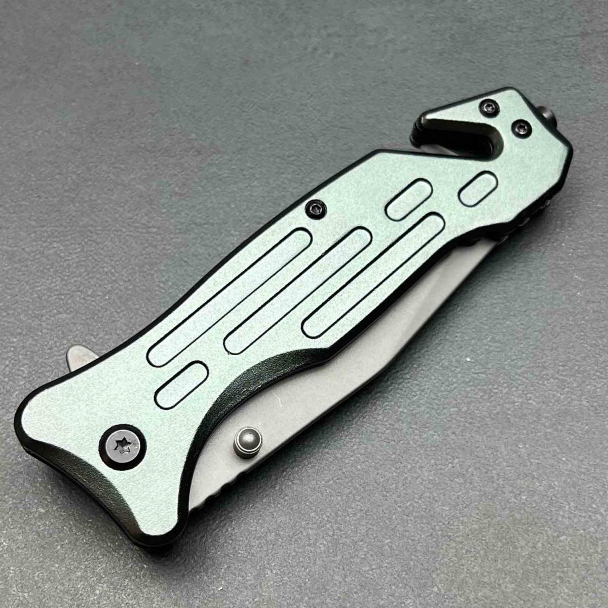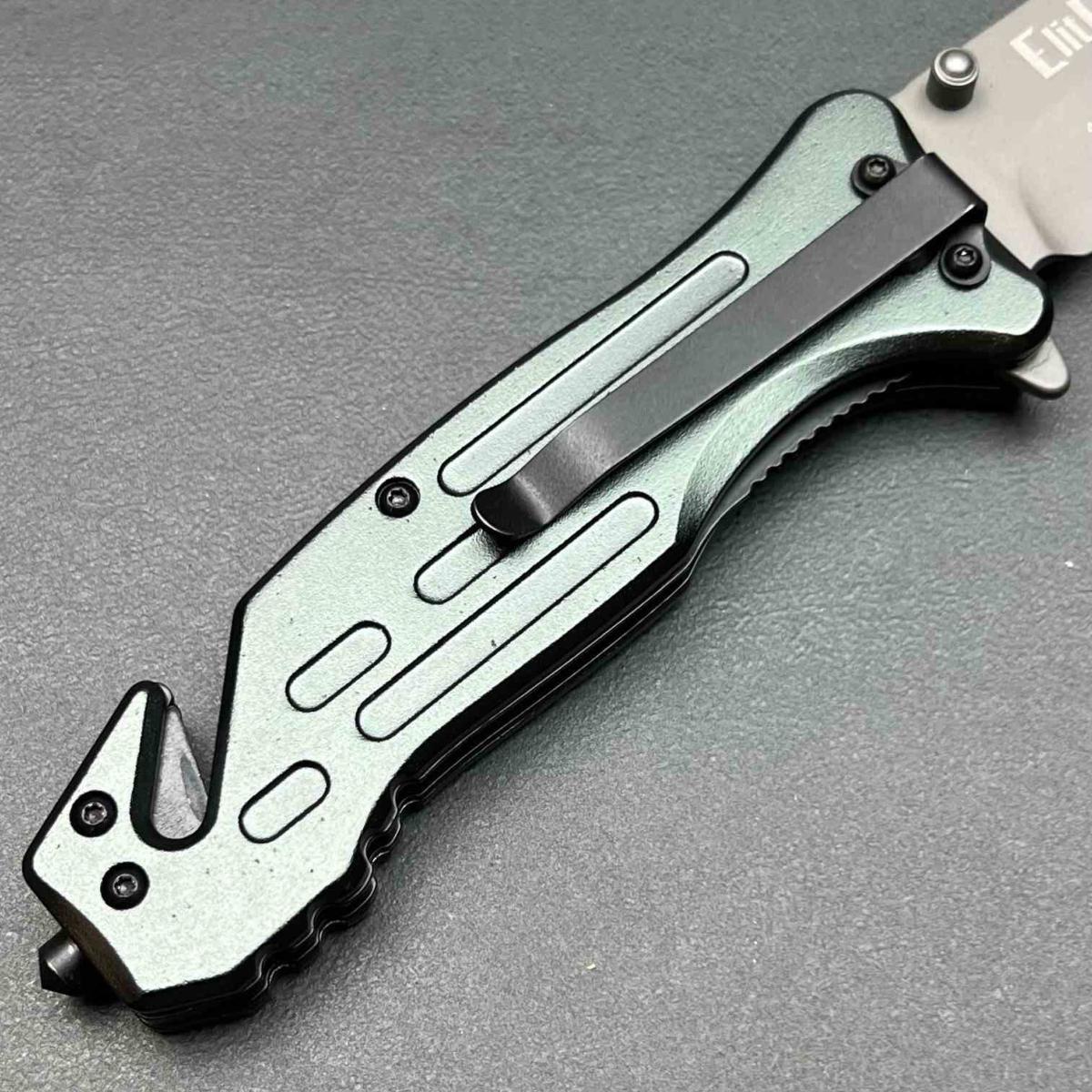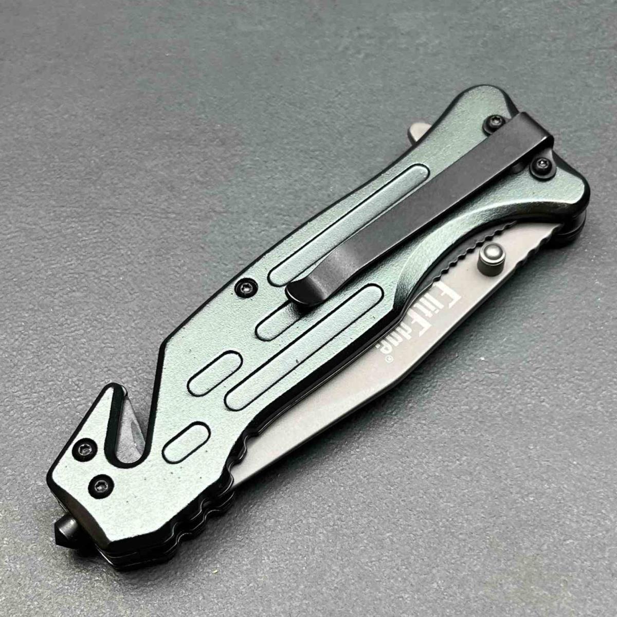 Le manche est fabriqué en Gray Aluminum (Aluminium gris), offrant une grande rigidité structurelle tout en restant léger. Ce modèle est un véritable couteau suisse du sauvetage, intégrant un Belt/cord cutter (coupe-ceinture) ainsi qu'un Glass breaker (brise-vitre) au pommeau. Il est complété par un clip de poche (Pocket clip) en acier pour un transport quotidien sécurisé et accessible.