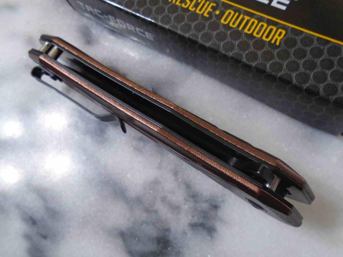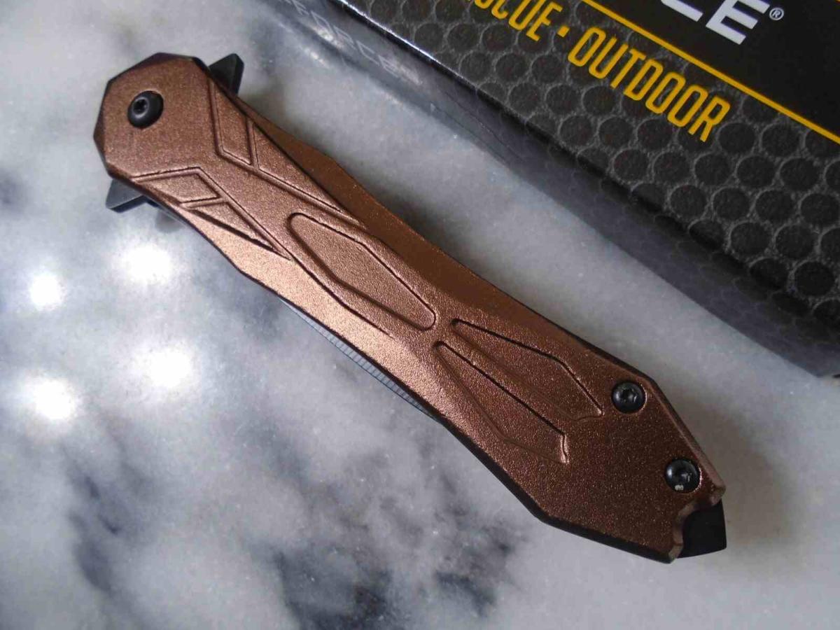 Le manche est fabriqué en Bronze Aluminum (aluminium anodisé bronze), offrant un excellent rapport légèreté/résistance. Sa couleur distinctive lui donne un aspect professionnel et moderne. Pour plus de sécurité, le manche intègre un brise-vitre à son extrémité, faisant de ce couteau un outil de secours précieux. Le verrouillage Linerlock assure une utilisation sûre, maintenant fermement la lame en position ouverte.