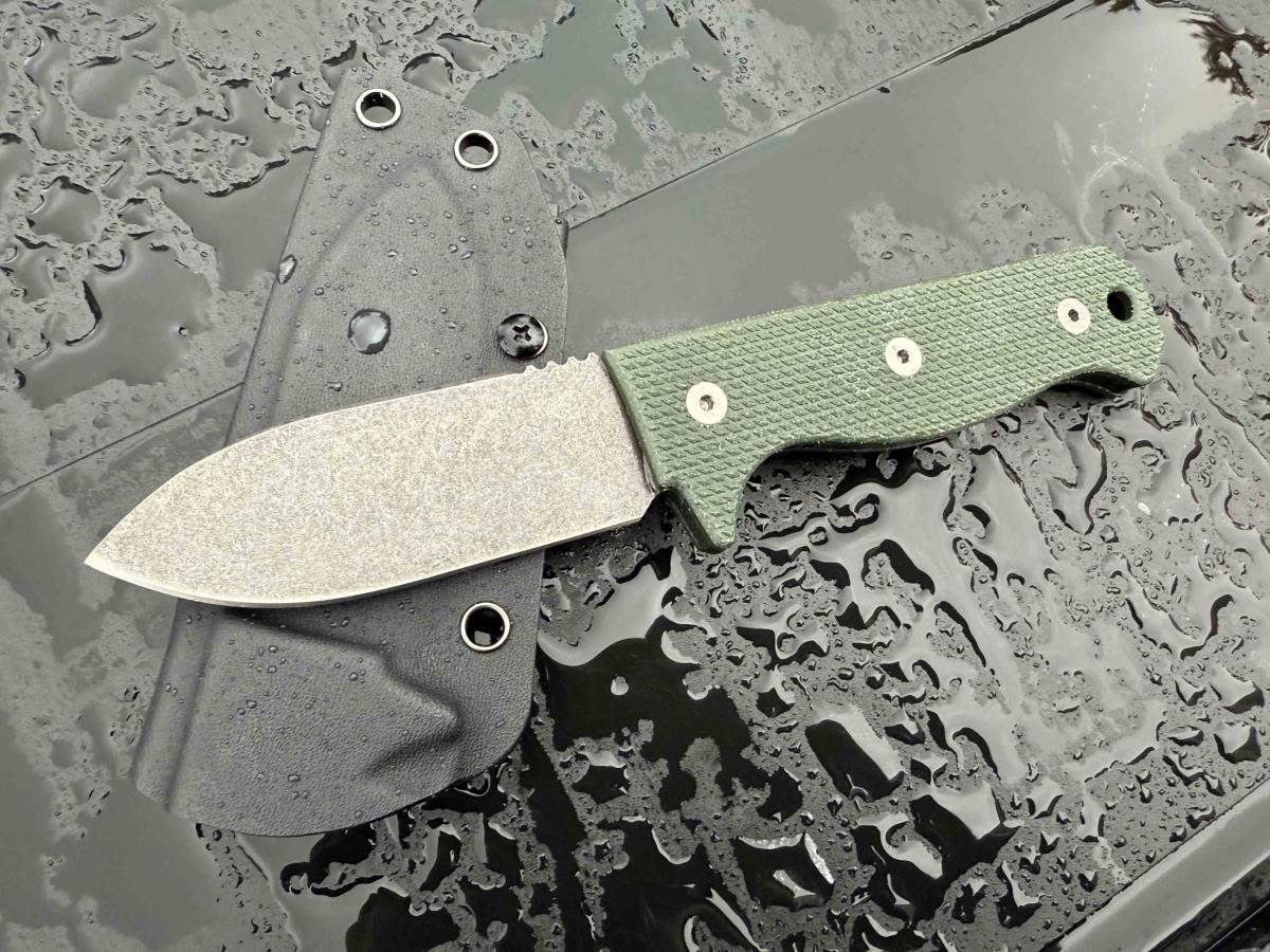 Le manche est en micarta vert canvas, offrant une prise en main confortable et antidérapante même en conditions humides. Le couteau est doté d’un trou pour dragonne, d’un talon prolongé et d’un étui ceinture en Kydex noir pour un port sécurisé.