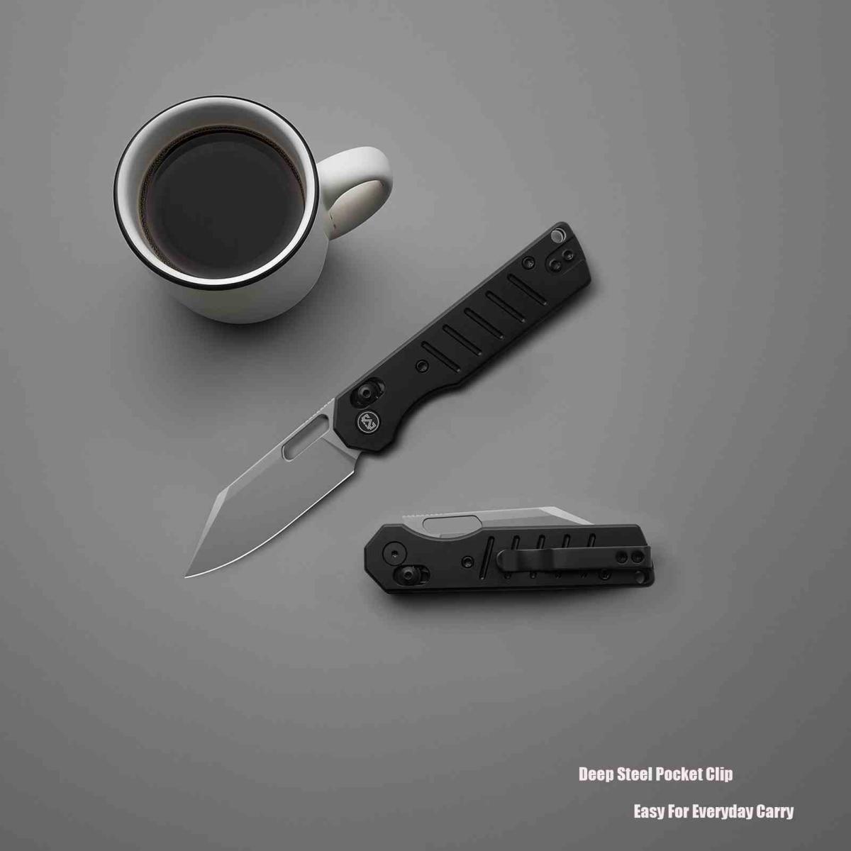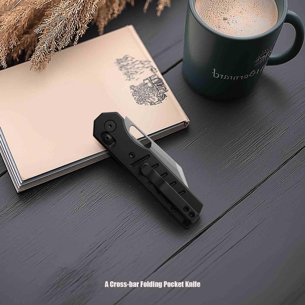 Son manche est en aluminium avec revêtement PVD noir, à la fois léger, solide et ergonomique. Le système de verrouillage cross-bar lock assure une sécurité fiable et une manipulation fluide. L’ouverture se fait via un thumb stud ambidextre, et le clip de poche réversible permet un port discret et adaptable. Un trou pour dragonne complète l’ensemble.