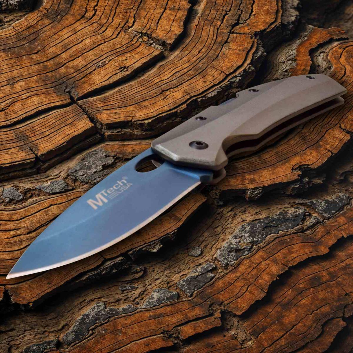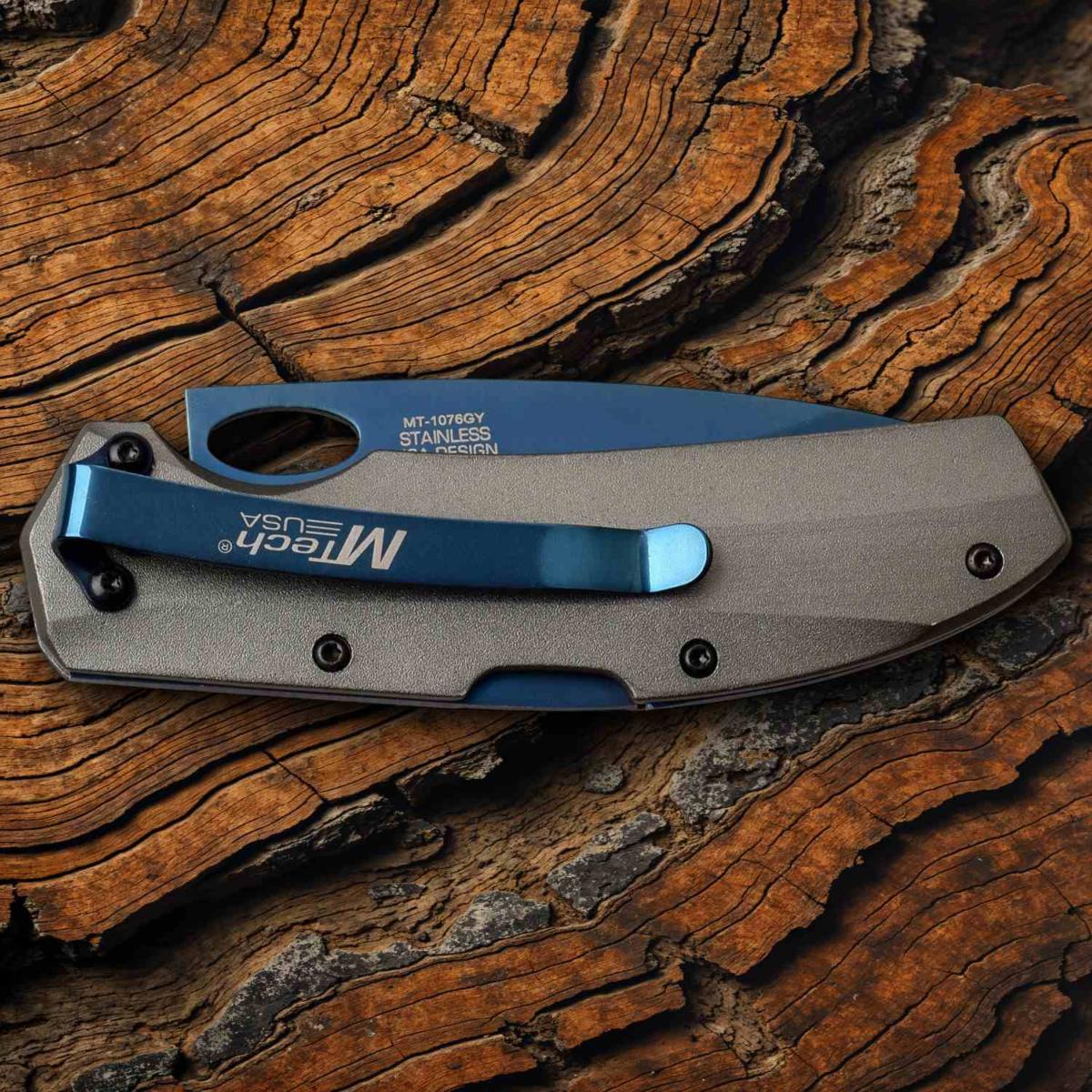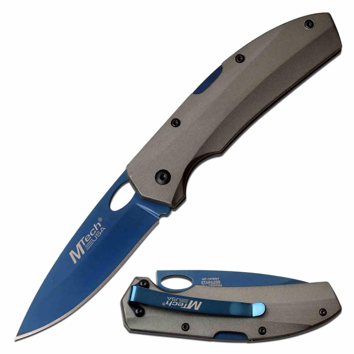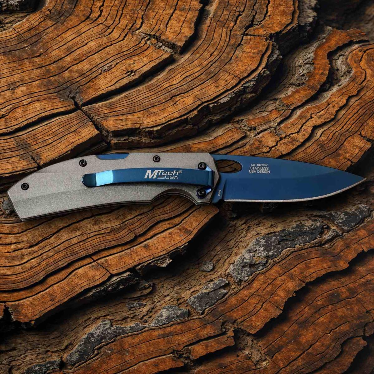 Le MTech USA MT1076GY est un couteau pliant compact et robuste, conçu pour l’EDC. Sa lame en acier inoxydable 3Cr13 de 7,6 cm (3"), avec finition TiNi bleue, combine résistance et esthétique. Le manche en aluminium anodisé gris assure légèreté et solidité.