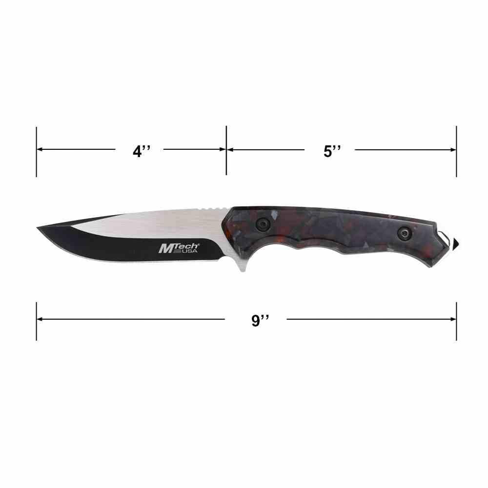 Le MTech MT-FIX006OG est un couteau à lame fixe qui combine un style visuel percutant et une fonctionnalité tactique. Idéal pour le bushcraft ou comme couteau de survie et de chasse, il est doté d'une construction en plate semelle (Full Tang) pour une résistance à toute épreuve. Son manche en acrylique bicolore rouge et noir est non seulement esthétique, mais intègre également un brise-vitre en extrémité. La lame drop point bicolore offre un tranchant polyvalent pour toutes vos activités outdoor.