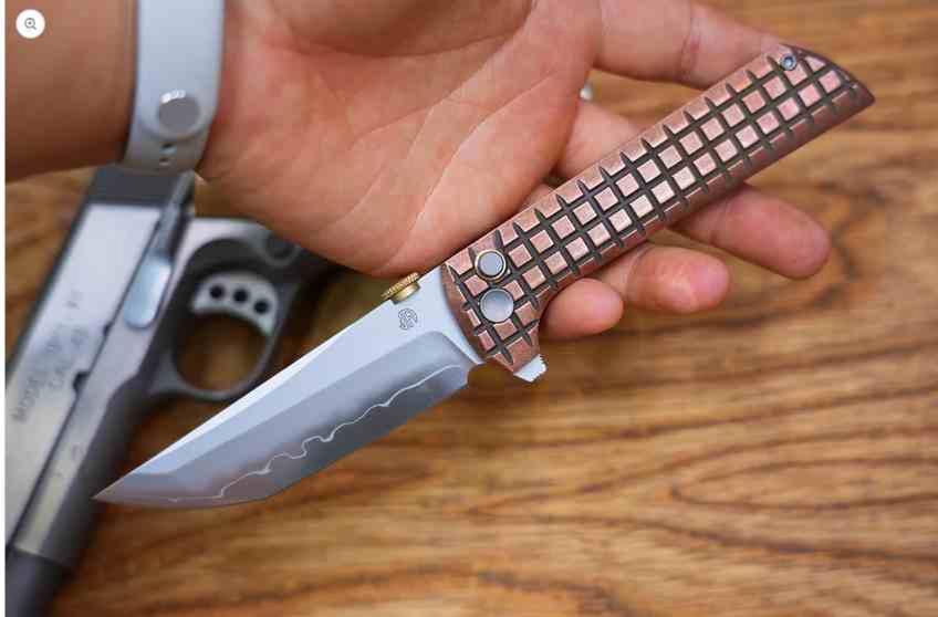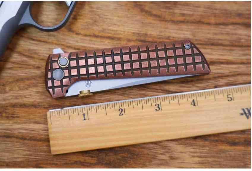 Le North Mountain CHOP2 2406‑CU est une version premium du CHOP2, conçue pour offrir une ouverture fluide, une mécanique précise et un style affirmé. Son thumb disc usiné CNC, inspiré d’une douille .45, permet une ouverture ambidextre rapide. Le manche en cuivre motif Grid apporte un look unique et une excellente prise en main. Le mécanisme button lock renforcé, associé à des roulements céramique montés dans une cage en laiton, garantit une fluidité exceptionnelle et un verrouillage sûr. La finition SLD‑Magic améliore la résistance aux rayures et donne au couteau une esthétique haut de gamme.
