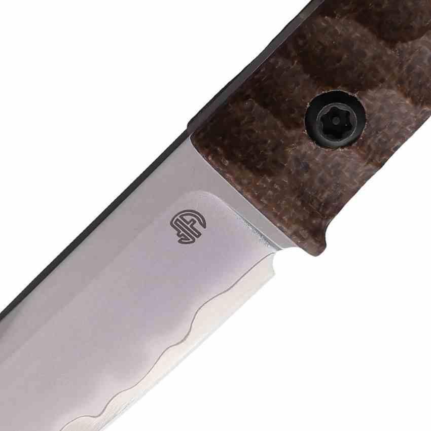 Le manche en micarta brun sculpté assure une prise en main confortable et sécurisée, même en conditions humides. Le couteau est monté en full tang pour une solidité maximale, avec un trou pour lanyard intégré. Il est livré avec un étui ceinture en Kydex noir et présenté en boîte.