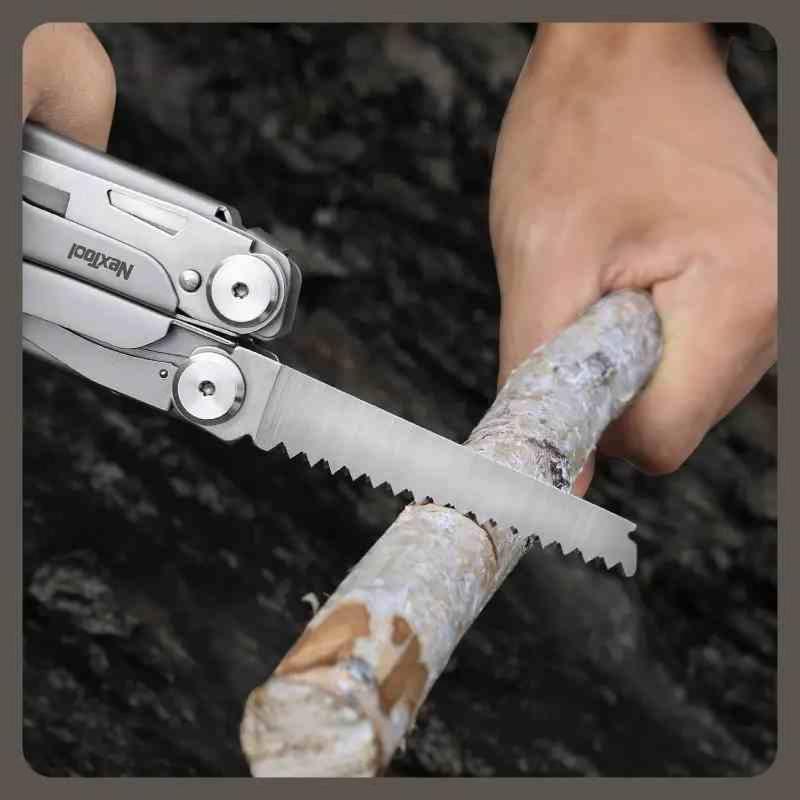Le manche est entièrement fabriqué en 20Cr13 Stainless Steel de couleur Silver (Argent), offrant une solidité structurelle à toute épreuve. Son design ergonomique regroupe 16 outils essentiels, incluant une pince à bec effilé, des coupe-fils remplaçables, une scie à bois efficace et un brise-vitre en carbure. Le multi-tool est livré avec une housse nylon robuste pour une protection optimale et un transport facile.