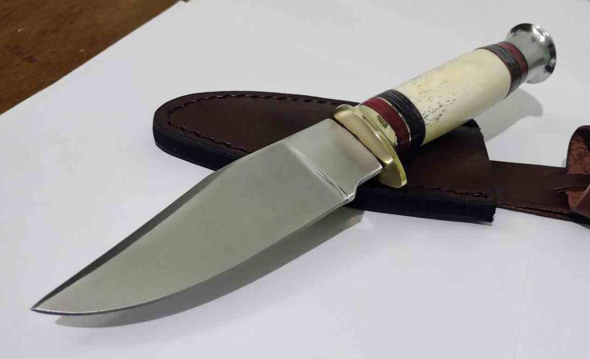 Le manche est une pièce maîtresse composée de plaquettes multi-matériaux associant de l'os poli (Smooth Bone) à du bois de pakka (Pakkawood) aux teintes marron et rouge. Cette structure est renforcée par une garde en Laiton (Brass guard) pour la protection des doigts et un pommeau massif en Aluminium (Aluminum pommel) pour un équilibre parfait. Il est livré avec sa housse Cuir marron de haute qualité, munie d'un passant pour le port à la ceinture.