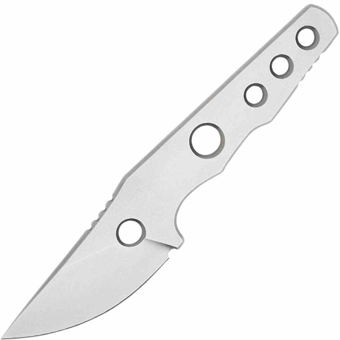 Le manche est de type lame fixe en structure squelettique intégrale, fabriqué à partir du même acier que la lame. Cette conception monobloc assure une durabilité maximale et permet une personnalisation facile par tressage de paracorde ou l'ajout de plaquettes artisanales. Malgré son profil fin, les contours sont arrondis pour offrir une prise en main à quatre doigts étonnamment confortable et sécurisée.
