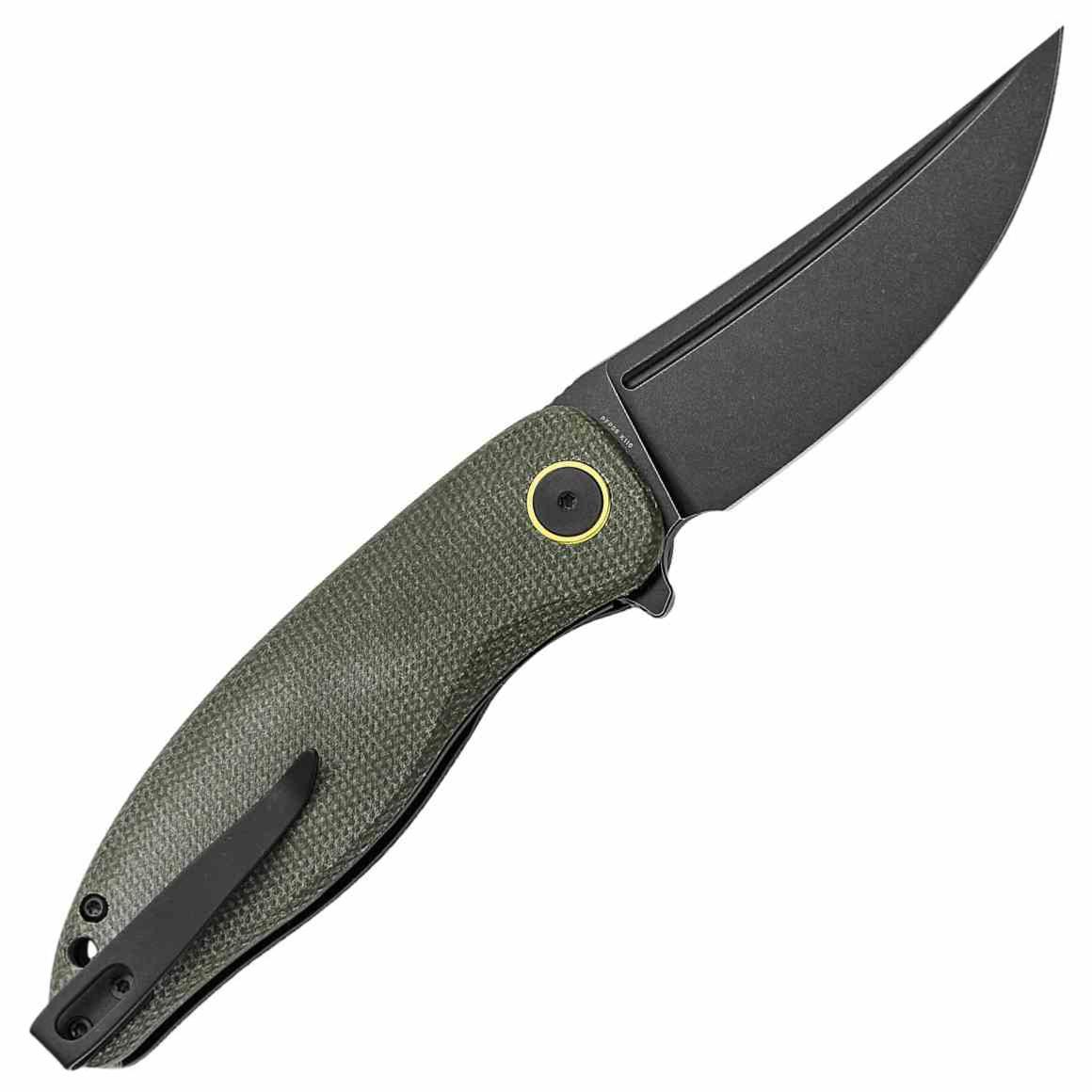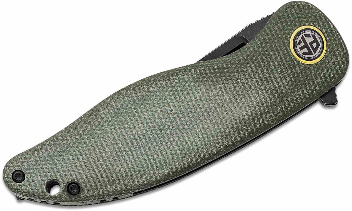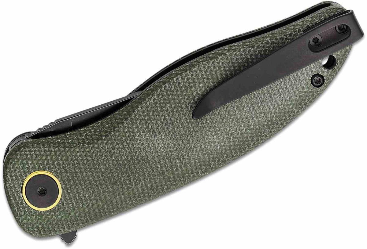 Le manche est composé de plaquettes en Green Micarta (Vert OD), un matériau composite offrant une prise en main extrêmement sûre et confortable, même avec les mains humides ou gantées. Sa forme ergonomique épouse parfaitement la paume pour un contrôle total lors des coupes de précision. La sécurité est assurée par un mécanisme Linerlock robuste. Il est équipé d'un clip de poche en acier inoxydable pour un transport quotidien sécurisé.