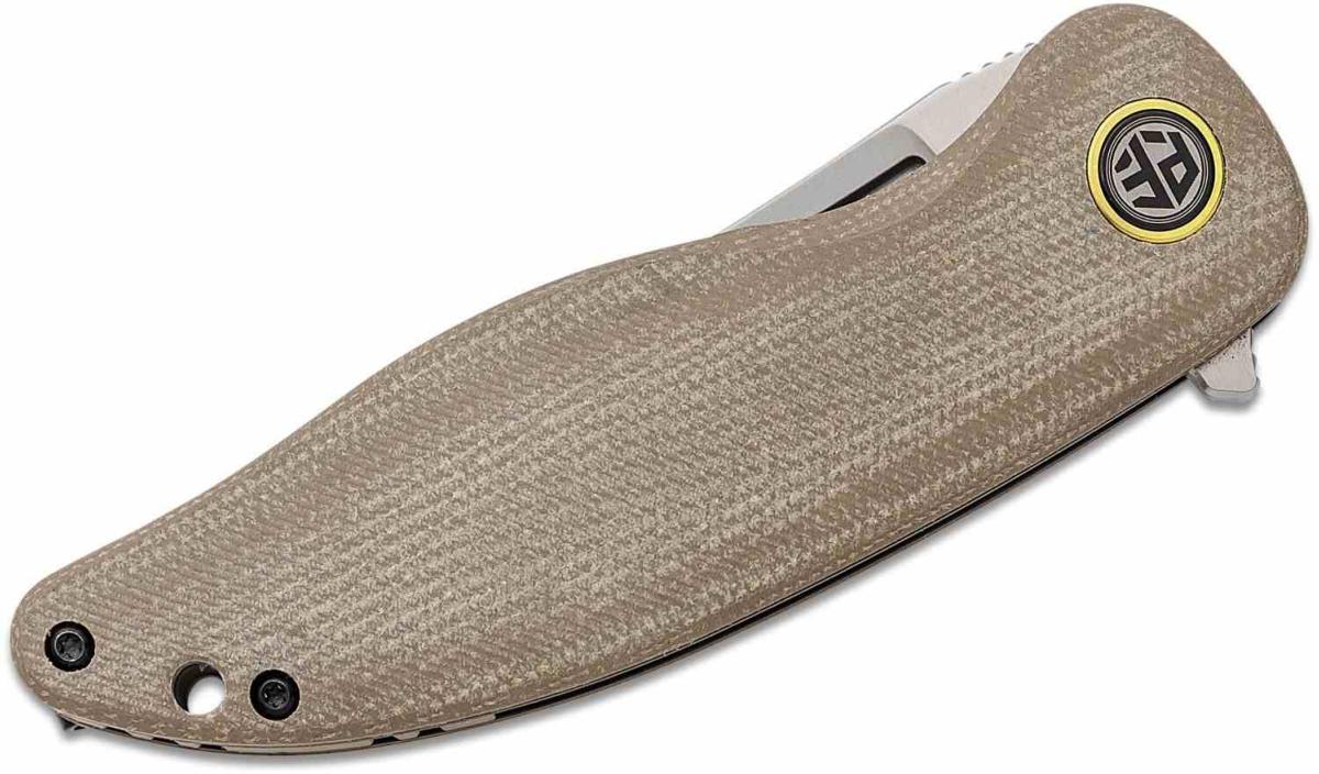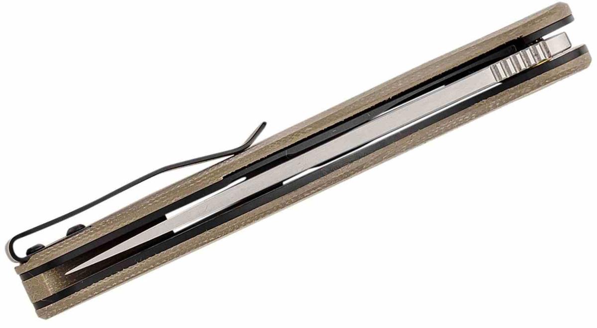 Le manche est composé de plaquettes en Khaki Micarta, un matériau composite offrant une prise en main extrêmement sûre et confortable, même avec les mains humides ou gantées. Sa forme ergonomique épouse parfaitement la paume pour un contrôle total lors des coupes de précision. La sécurité est assurée par un mécanisme Linerlock robuste. Il est équipé d'un clip de poche en acier inoxydable pour un transport quotidien sécurisé.