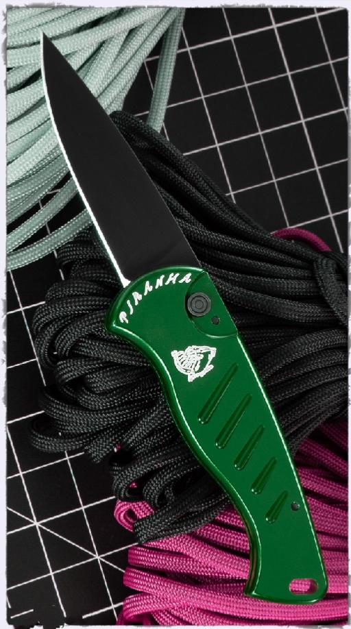 Descriptif : Le couteau Automatique Piranha est doté d'une lame drop point en acier 154CM 60-61HRC avec une finition blackwash. L'ouverture automatique d'une main est très rapide grâce au ressort qui déploie la lame. Le manche est en aluminium 6061-T6 green. La sécurité Button Lock assure un blocage parfait de la lame. Le clip permet un accès rapide au couteau. Le couteau est fabriqué aux USA.