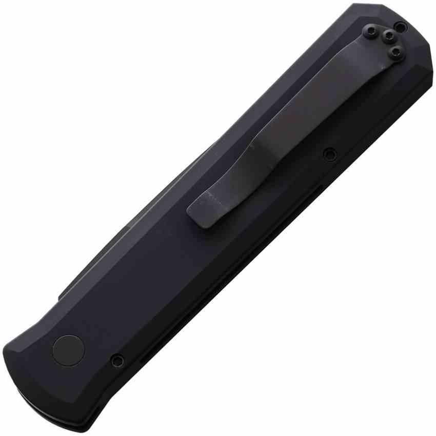 L’ouverture est automatique à bouton-poussoir, avec un mécanisme Pro-Tech réputé pour sa rapidité fulgurante et sa solidité. Le manche est usiné en aluminium aéronautique 6061-T6, anodisé noir, avec des contours ergonomiques et une finition lisse. Le clip de poche est en acier inoxydable, positionné en tip-up pour un port discret.