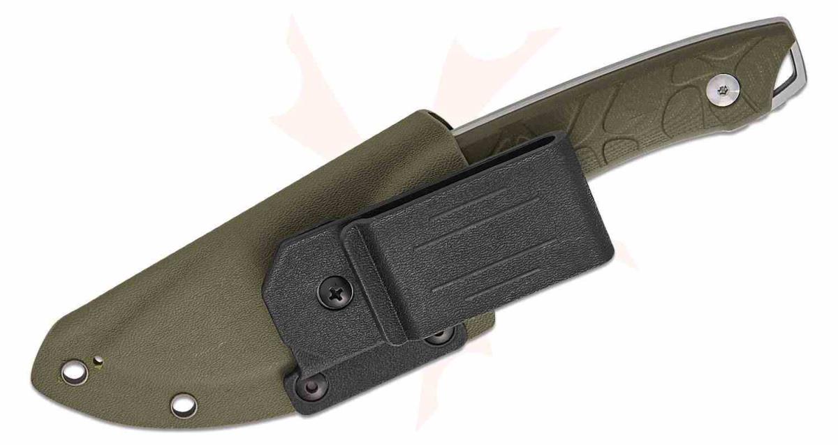 Le manche est en G10 vert OD, texturé pour une excellente adhérence et une esthétique militaire. Sa construction pleine soie garantit solidité et équilibre. Livré avec un étui Kydex moulé, il se porte facilement à la ceinture et reste sécurisé en toutes circonstances.