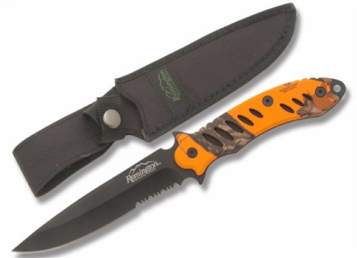 Descriptif: Poignard Couteau de Chasse Remington - Lame clip point avec dents enacier 440 - Lame plate semelle - Plaquettes du manche en acier finitionorange camo - Housse cordura