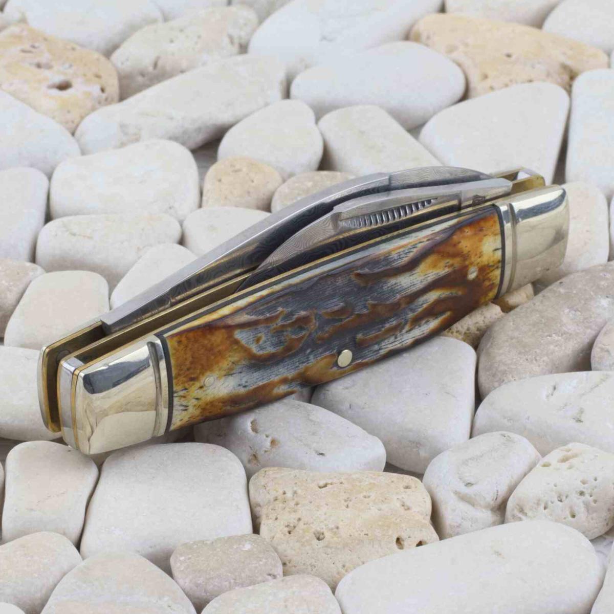 Le Rough Ryder Senator Cinnamon Bone Damascus est un couteau de poche traditionnel qui allie élégance et fonctionnalité. Ses deux lames en acier damas (spear point et wharncliffe) révèlent des motifs ondulés uniques, fruits du forgeage multicouches. Elles offrent une excellente résistance et une bonne tenue de coupe.
