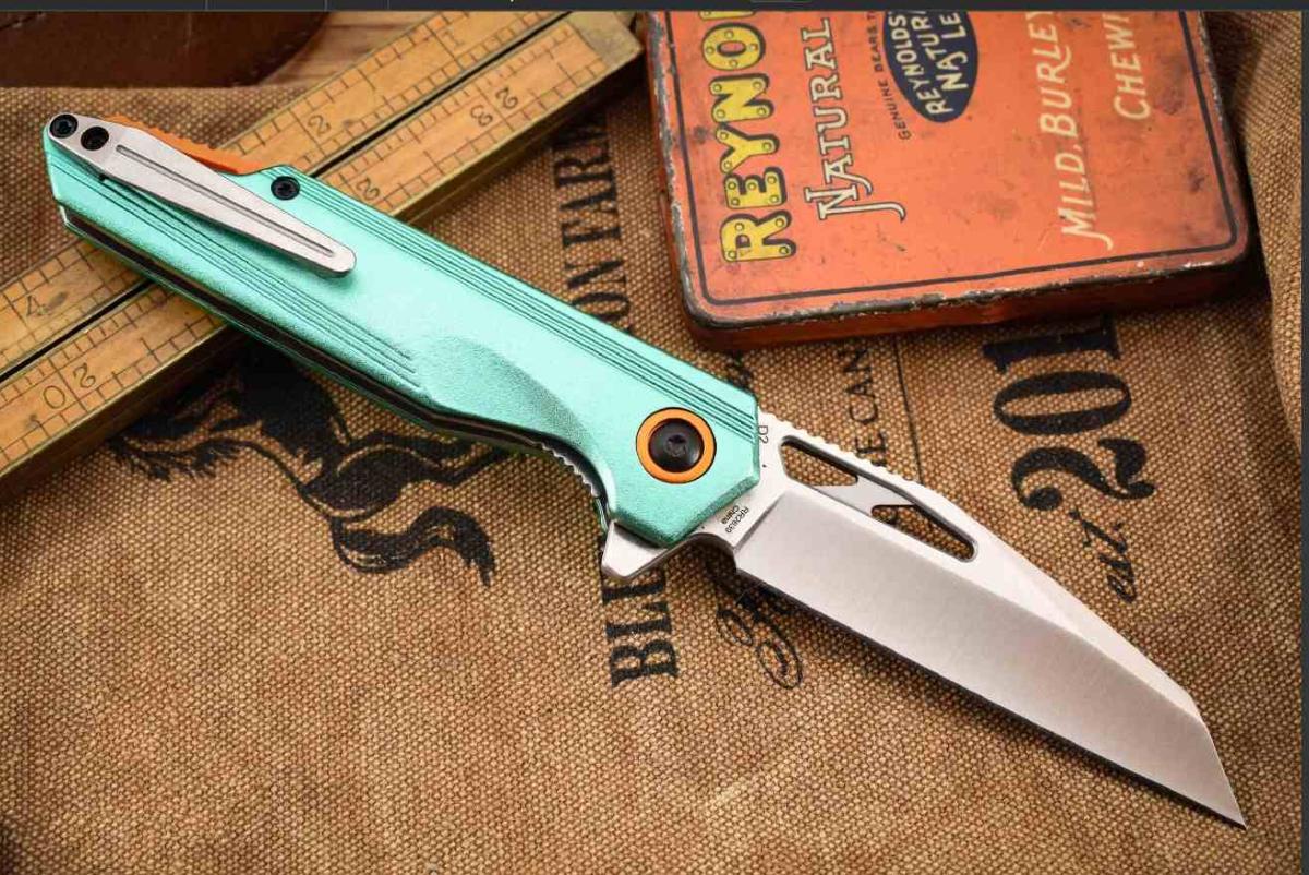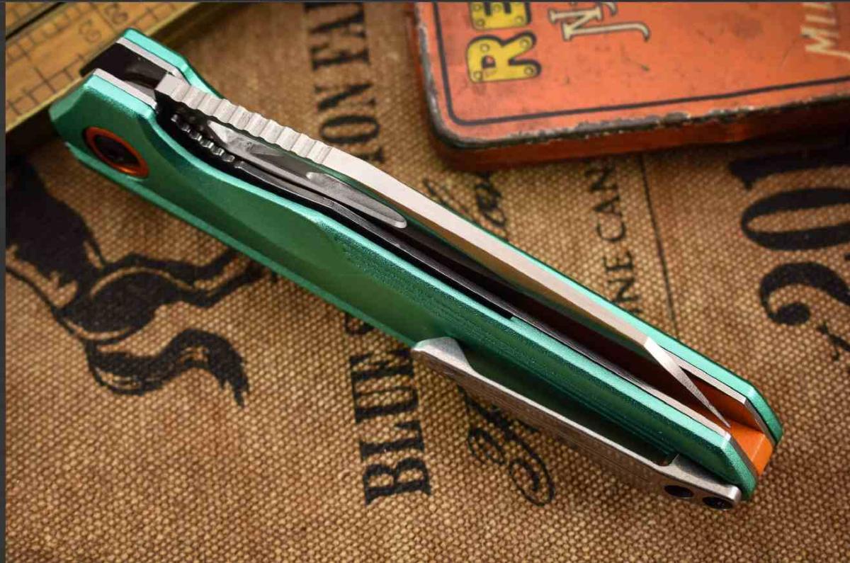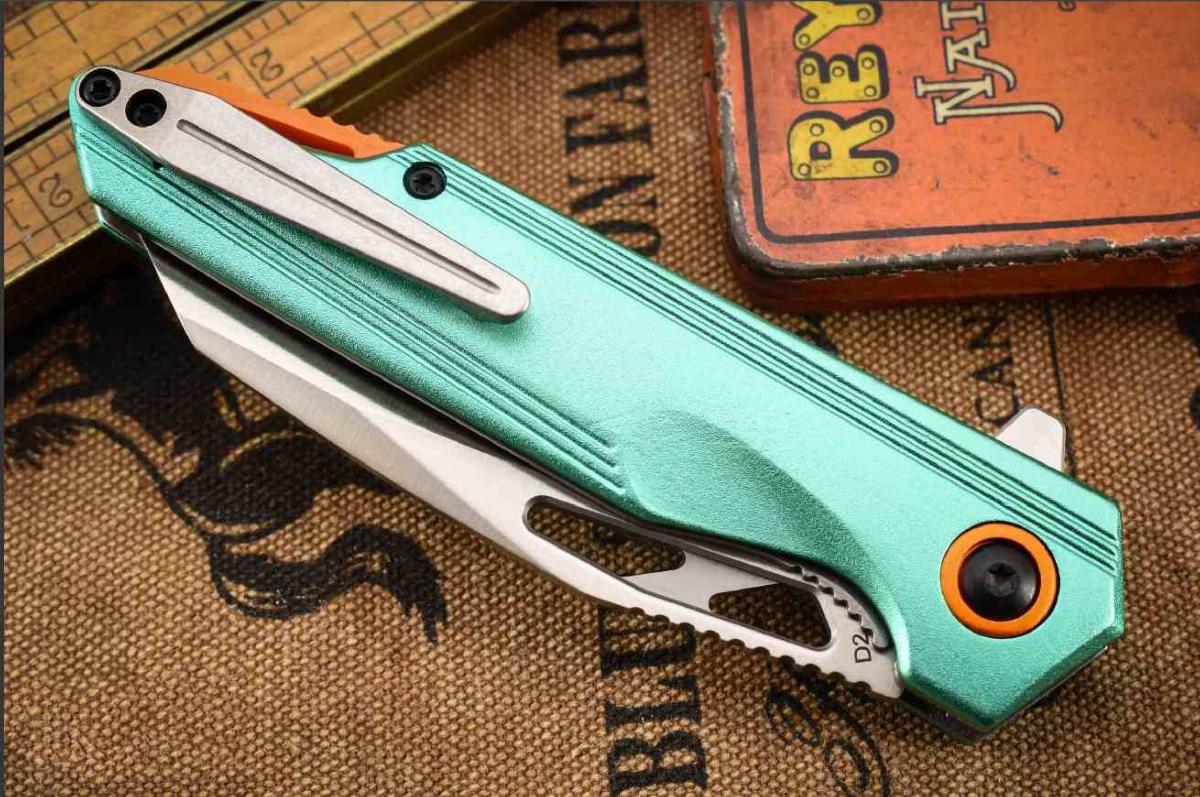L’ouverture se fait via un flipper, avec une action fluide grâce à un détent bien calibré, selon les retours utilisateurs. Le liner lock sécurise la lame en position ouverte, garantissant une utilisation sans risque. Le manche en aluminium anodisé teal est léger, texturé pour une bonne prise en main, et rehaussé par des accents orange autour du pivot et du backspacer.
