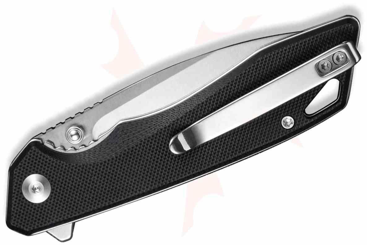 Le manche est en G10 noir, texturé pour une prise en main sécurisée, avec un clip de poche tip-up réversible pour droitier ou gaucher. Le design est plat, discret et optimisé pour le port quotidien.