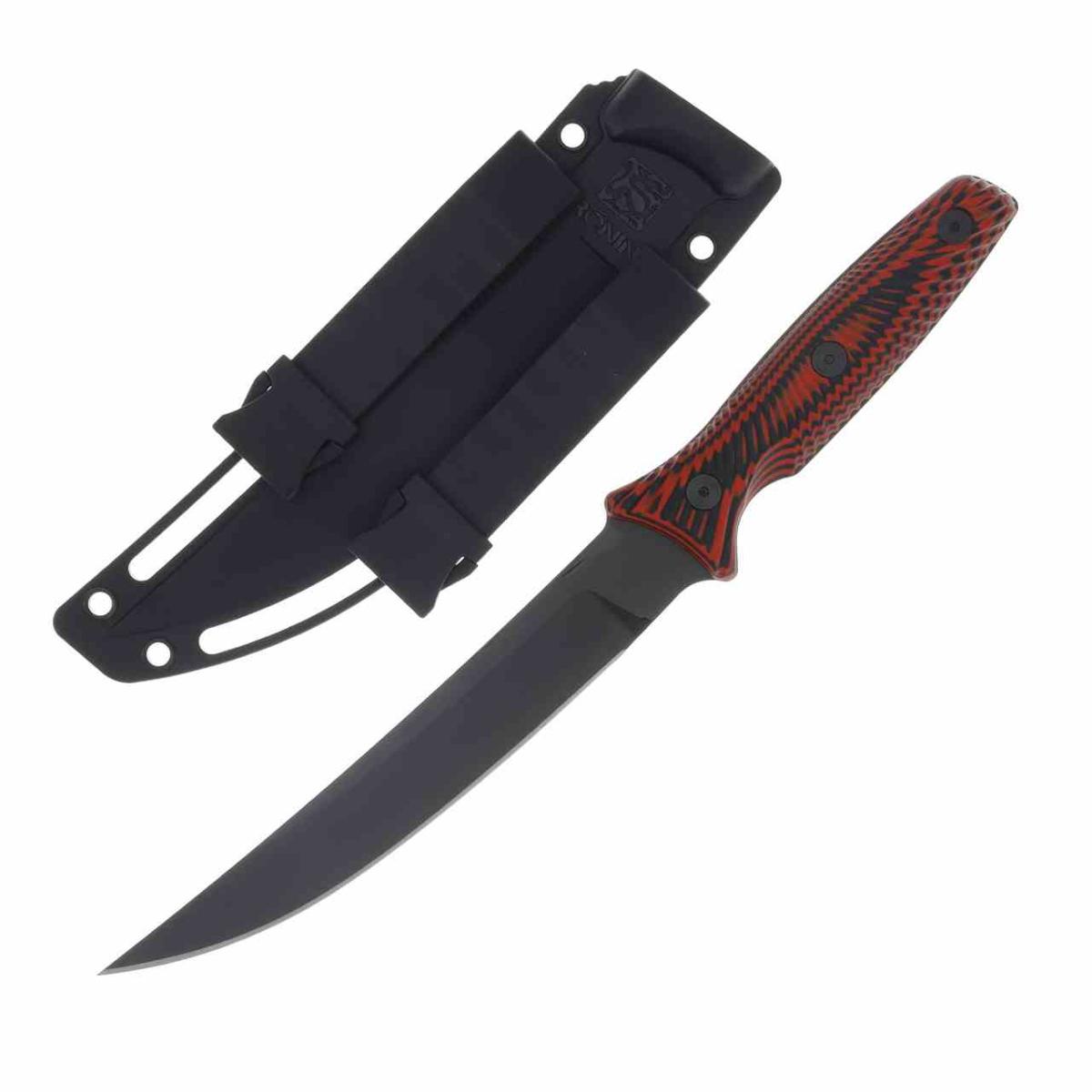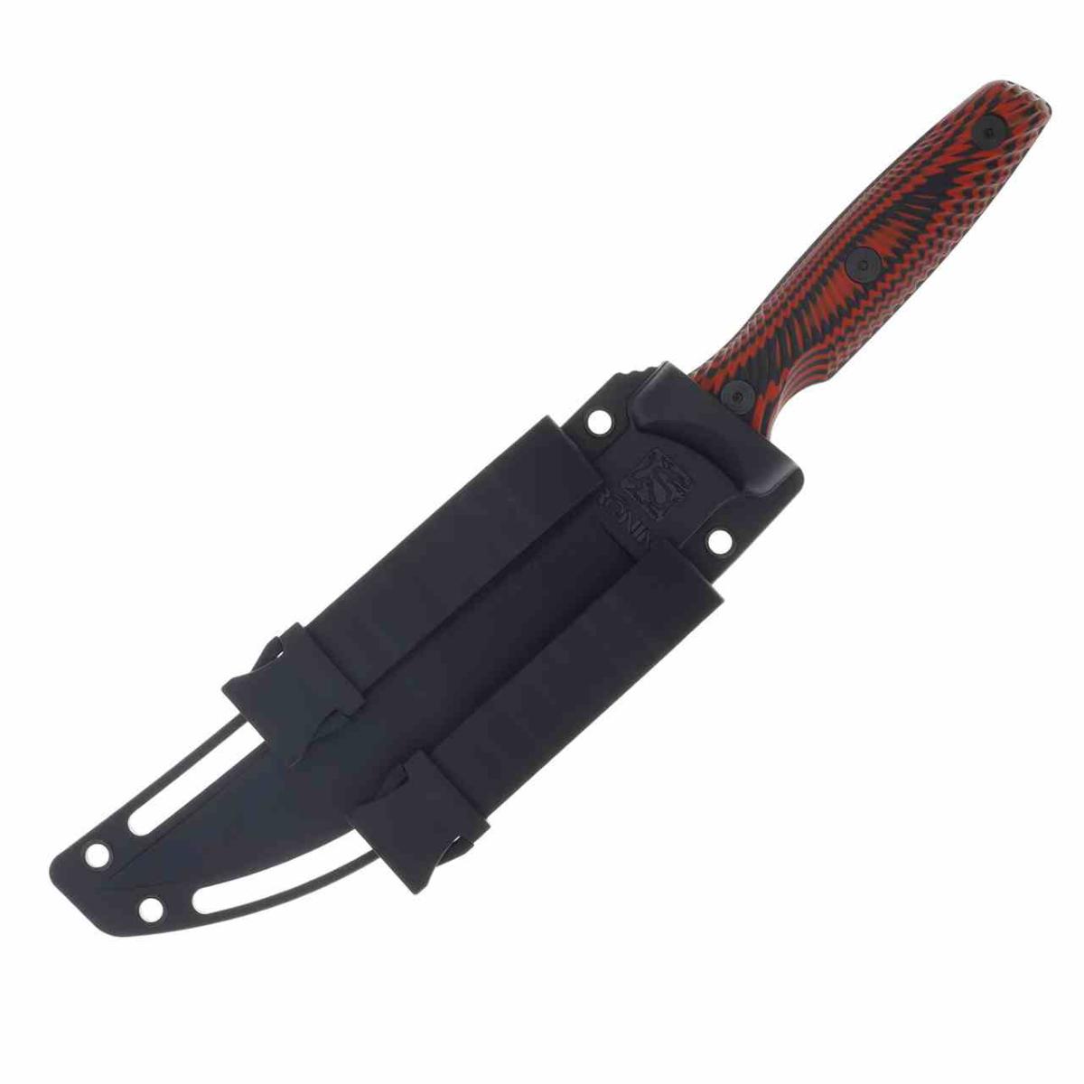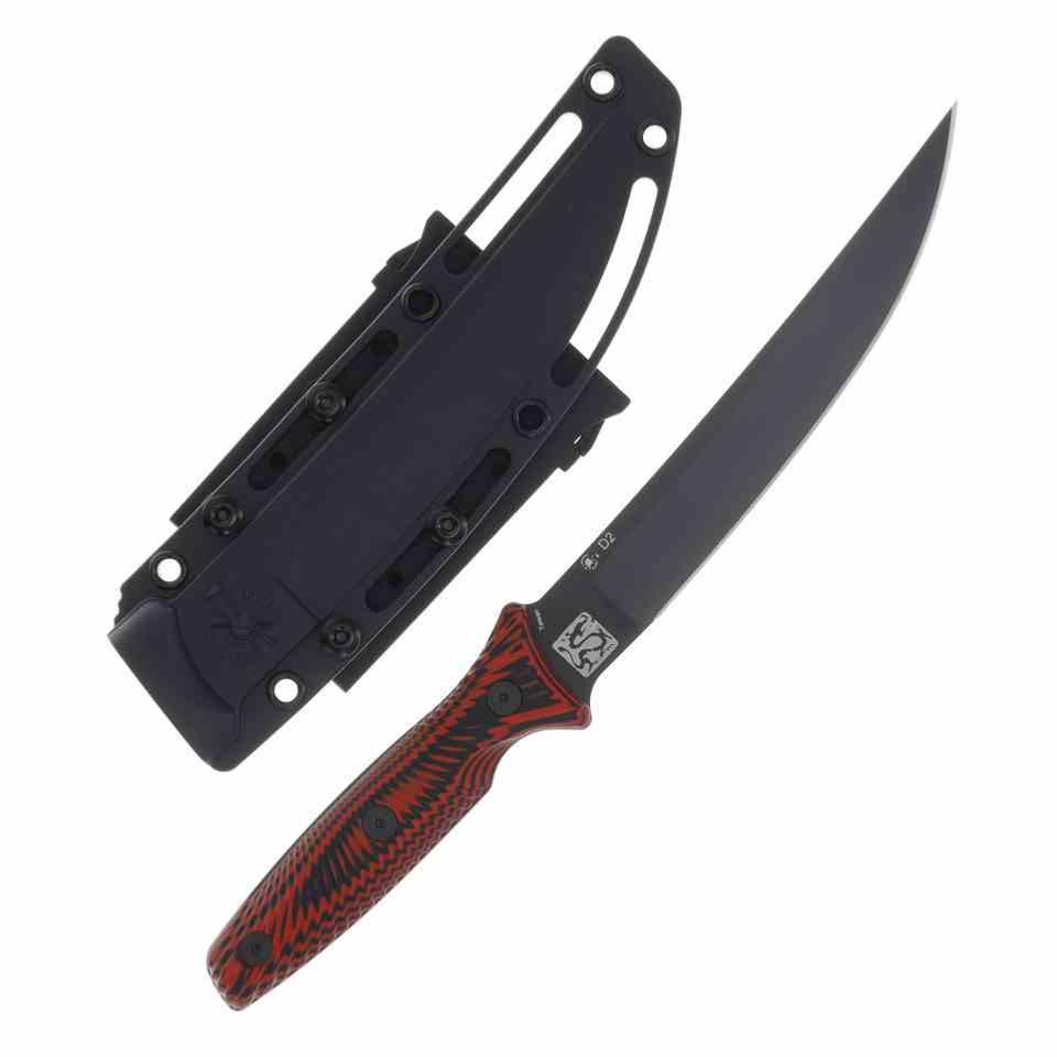 Le manche est composé de plaquettes en Red and Black G10 sculptées avec des contours ergonomiques (Contoured). Le mélange de couches rouges et noires offre un grip texturé exceptionnel et une résistance totale aux variations climatiques. La forme du manche permet un contrôle total de la lame dans toutes les positions de coupe. Il est accompagné d'un étui en plastique moulé noir doté d'un clip de ceinture polyvalent.