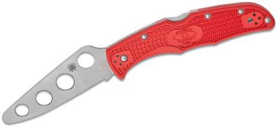 Le Delica Trainer est identique en poids et en taille au modèle "live". Pour améliorer l'équilibre de la pièce, Spyderco a effilé la pointe non aiguisée et percé des trous dans la lame, supprimant ainsi le poids inutile. La texture Volcano grip sur les deux côtés du manche empêche votre main de glisser pendant l'entraînement. Tous les modèles d'entraînement Spyderco ont des manches rouges désignant qu'ils ne sont pas aiguisés.