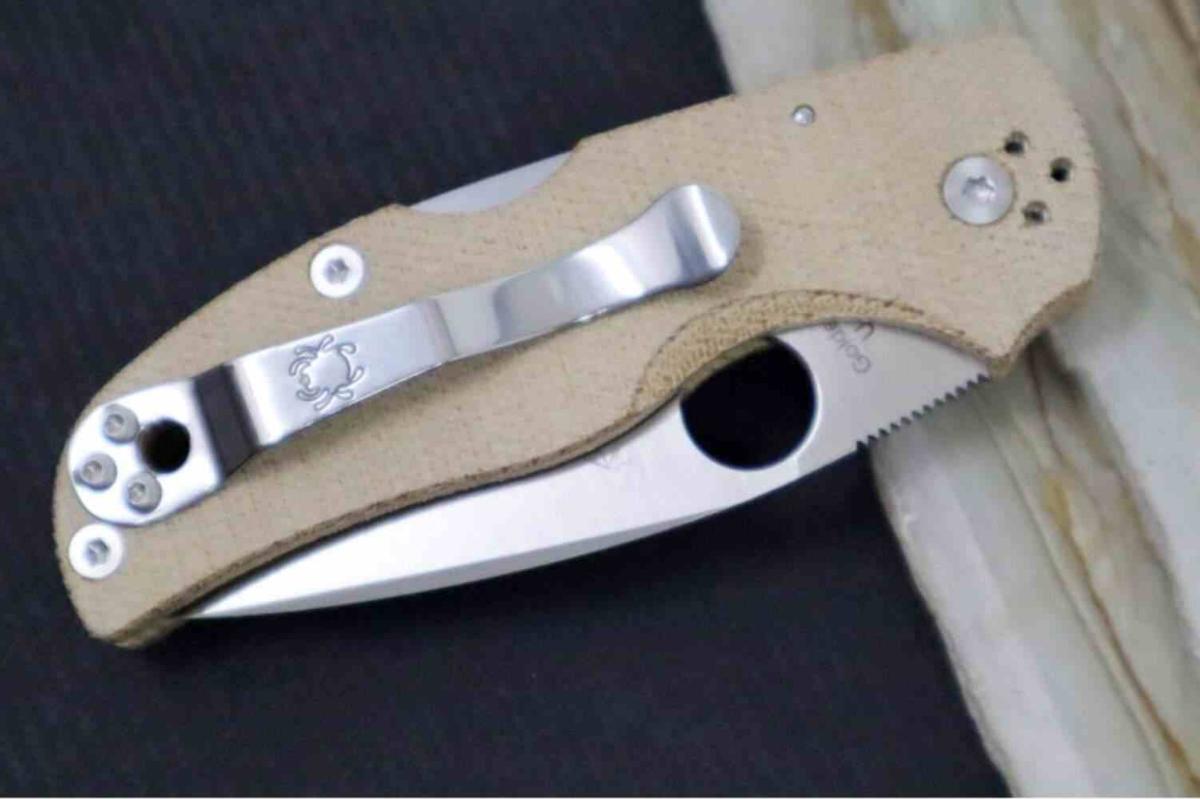 Le manche est en micarta canvas brun, offrant une texture naturelle, une excellente adhérence et un vieillissement esthétique au fil du temps. Le clip de poche est réversible 4 positions (tip-up/tip-down, gauche/droite), pour un port totalement personnalisable.