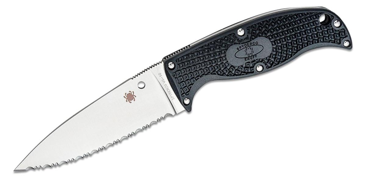 Descriptif : Le couteau Spyderco Enuff 2 est doté d'une lame Leaf-Shaped avec dents en acier VG-10 59-61HRC avec une finition satinée. De conception plate semelle l'Enuff 2 possède des plaquettes en FRN avec un trou à l'extrémité pour le cordon de sécurité. L'étui polymère permet le port à la ceinture. Le couteau est fabriqué au Japon.