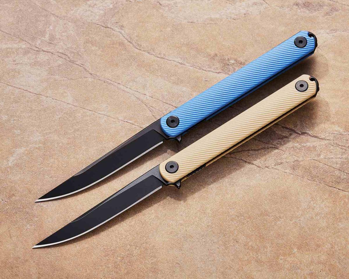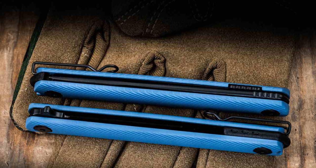 Le manche est composé de plaquettes en Blue GFN (nylon renforcé de verre) arborant une texture sculptée en 3D. Ce design garantit une prise en main extrêmement sûre, même dans des conditions difficiles, tout en maintenant un profil affiné pour un transport quotidien confortable. La sécurité est assurée par un mécanisme Linerlock en acier inoxydable parfaitement ajusté. Il est équipé d'un clip de poche réversible pour un port ambidextre.