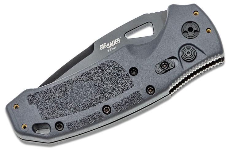 Descriptif : Le couteau automatique SIG Sauer K320A est doté d'une lame drop point en acier S30V 59-61HRC avec une finition black. L'ouverture automatique est très rapide grâce au ressort qui déploie la lame. Le manche est en polymère grey avec un trou dans le manche pour le cordon de sécurité. La sécurité Push Button assure un blocage parfait de la lame et le clip un accès rapide au couteau. Le couteau est fabriqué aux USA.