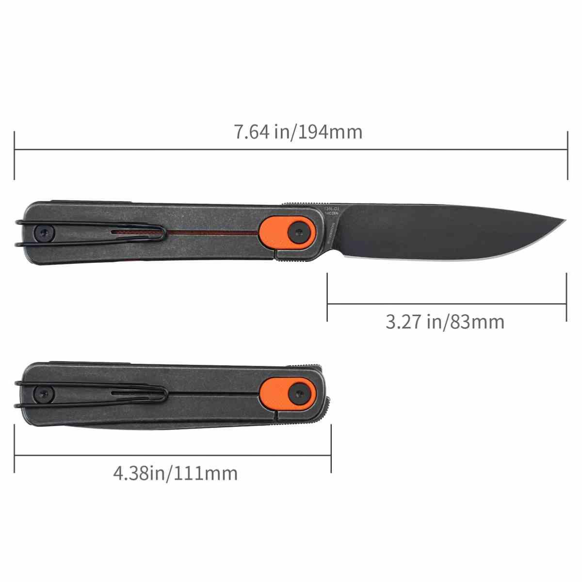 Le manche combine G10 orange vif texturé et plaques en acier inoxydable, offrant une excellente prise en main et une rigidité renforcée. Le système de verrouillage frame lock assure une sécurité fiable, tandis que le flipper invisible intégré permet une ouverture fluide et discrète. Le pivot à roulement céramique garantit une action rapide et silencieuse.
