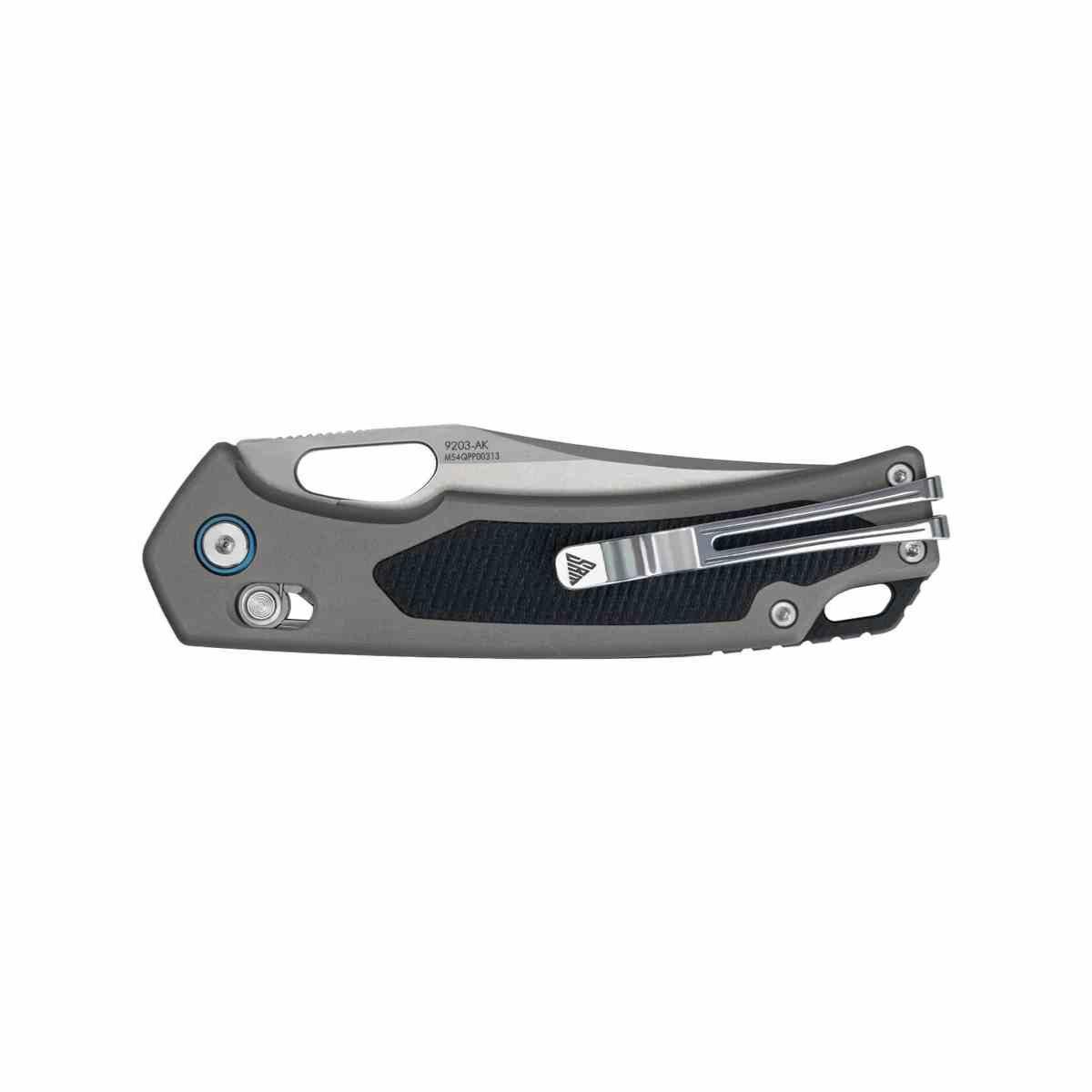 Le manche en aluminium gris est doté d’un insert G10 noir pour une meilleure adhérence. Le système de verrouillage Ambi Lock (crossbar lock) assure une sécurité ambidextre fiable, tandis que le clip de poche réversible permet un port tip-up à gauche ou à droite. Le pivot à roulement à billes en acier garantit une ouverture fluide, même avec des gants, grâce à l’encoche de pouce.