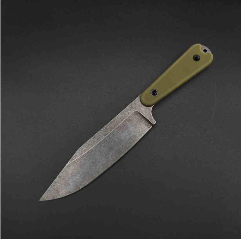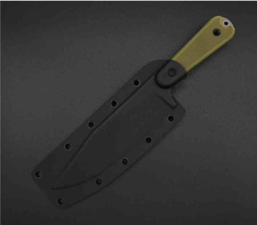 Le manche est équipé de plaquettes en OD Green G10, un matériau composite extrêmement durable qui offre une prise en main sécurisée. La soie prolongée (extended tang) permet d'utiliser le bout du manche pour des fonctions d'impact. Ce couteau est un modèle de type étui kydex et est livré avec son étui en Kydex noir pour un port à la ceinture.