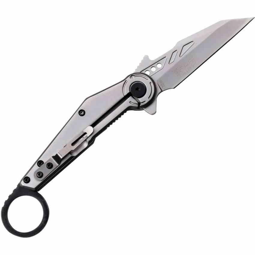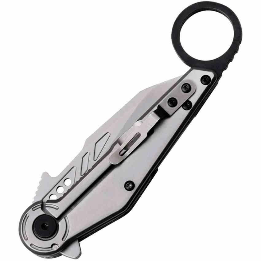 Le manche en aluminium gris intègre l’anneau arrière typique des karambits, assurant une prise en main sûre et polyvalente. Ce modèle se distingue par un coupe‑sangle intégré sur le dos, déployable via un thumb stud dédié, permettant de sectionner sangles et cordages sans exposer la lame principale. Le système de verrouillage liner lock garantit une sécurité fiable, tandis que l’ouverture assistée par flipper assure un déploiement rapide et fluide.