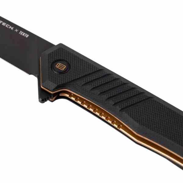 Le Manche devant la matière Black G10 (G10 Noir) offre une durabilité thermique et une adhérence texturée parfaite pour une prise en main sûre. Le design est sublimé par un Bronze Backspacer (entretoise bronze) et des accents assortis sur la visserie. Le mécanisme de verrouillage Liner Lock assure une sécurité totale. Pour un transport quotidien (EDC) optimal, il dispose d'un clip Deep Carry réversible et d'un brise-vitre intégré au pommeau.