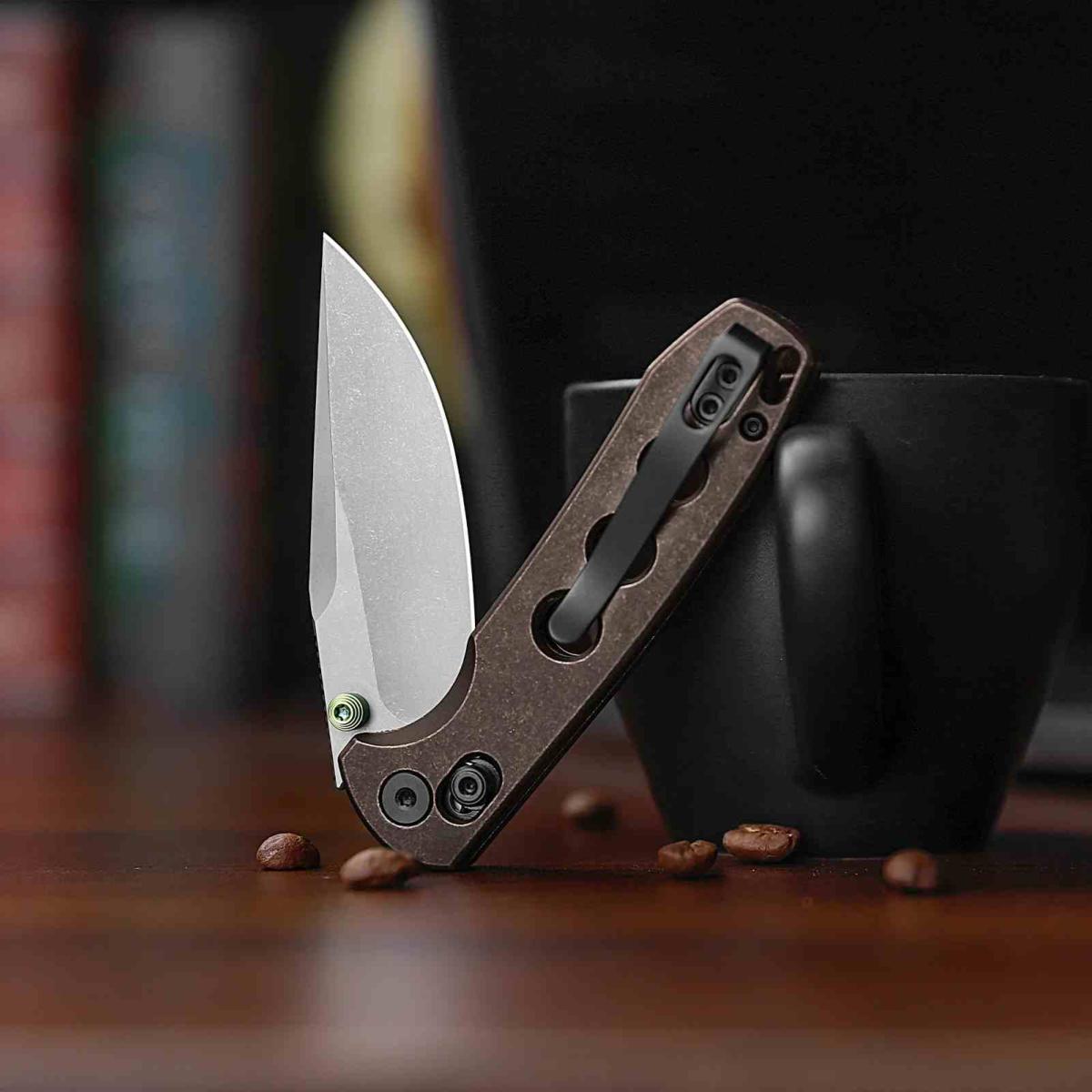 Le manche est composé de plaquettes en Copper (Cuivre), un matériau dense et noble qui offre un équilibre parfait et une esthétique vintage haut de gamme. Le mécanisme de verrouillage est un Crossbar Lock (Axis Lock), assurant un blocage de lame ultra-solide et une manipulation ambidextre sécurisée. Le couteau inclut également un Pocket Clip robuste et un Rope Hole (trou pour lanière) intégré pour un transport polyvalent.