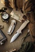 Le manche est composé de plaquettes en Tan G10 (beige/sable), un matériau composite extrêmement durable, résistant à l'eau et aux chocs. L'ergonomie du manche permet une prise en main naturelle et sécurisée. La sécurité est assurée par un mécanisme Button Lock (verrouillage par bouton) très intuitif, permettant de refermer le couteau d'une seule main sans effort. Il est équipé d'un clip de poche en acier inoxydable et d'un passage pour lanière (lanyard hole) intégré à la soie étendue.