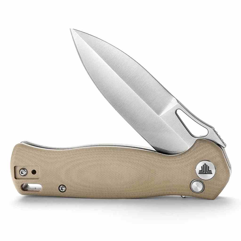 La lame au profil Drop Point est forgée en Lame Acier 14C28N Sandvik, un acier suédois de haute performance réputé pour son excellente résistance à la corrosion et sa capacité à conserver un tranchant rasoir. Elle bénéficie d'une finition Satin raffinée et affiche une dureté de 58-60 HRC. L'ouverture est facilitée par un Thumb Pull (encoche de pouce) et une ouverture flipper sur roulements à billes en céramique, garantissant un déploiement instantané.