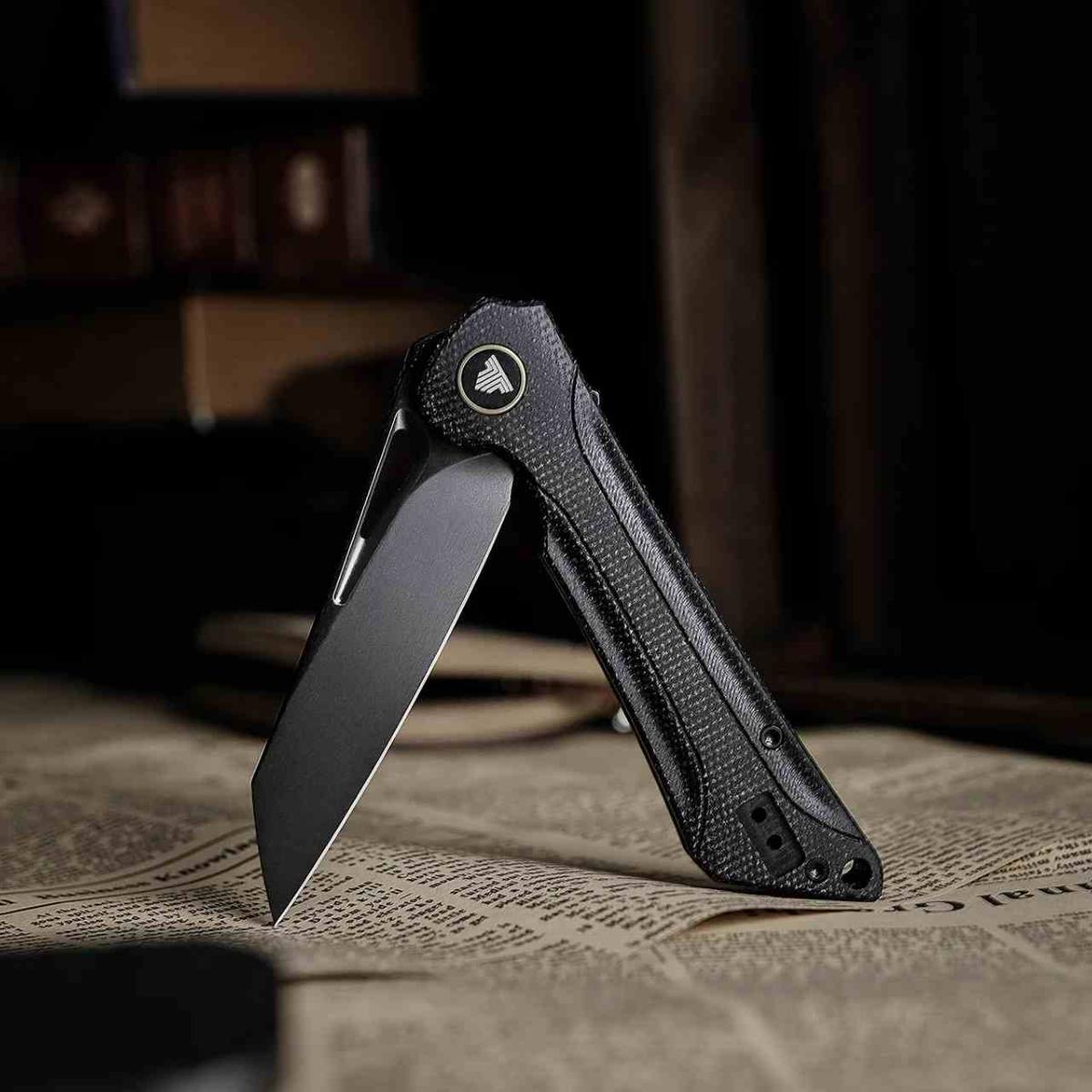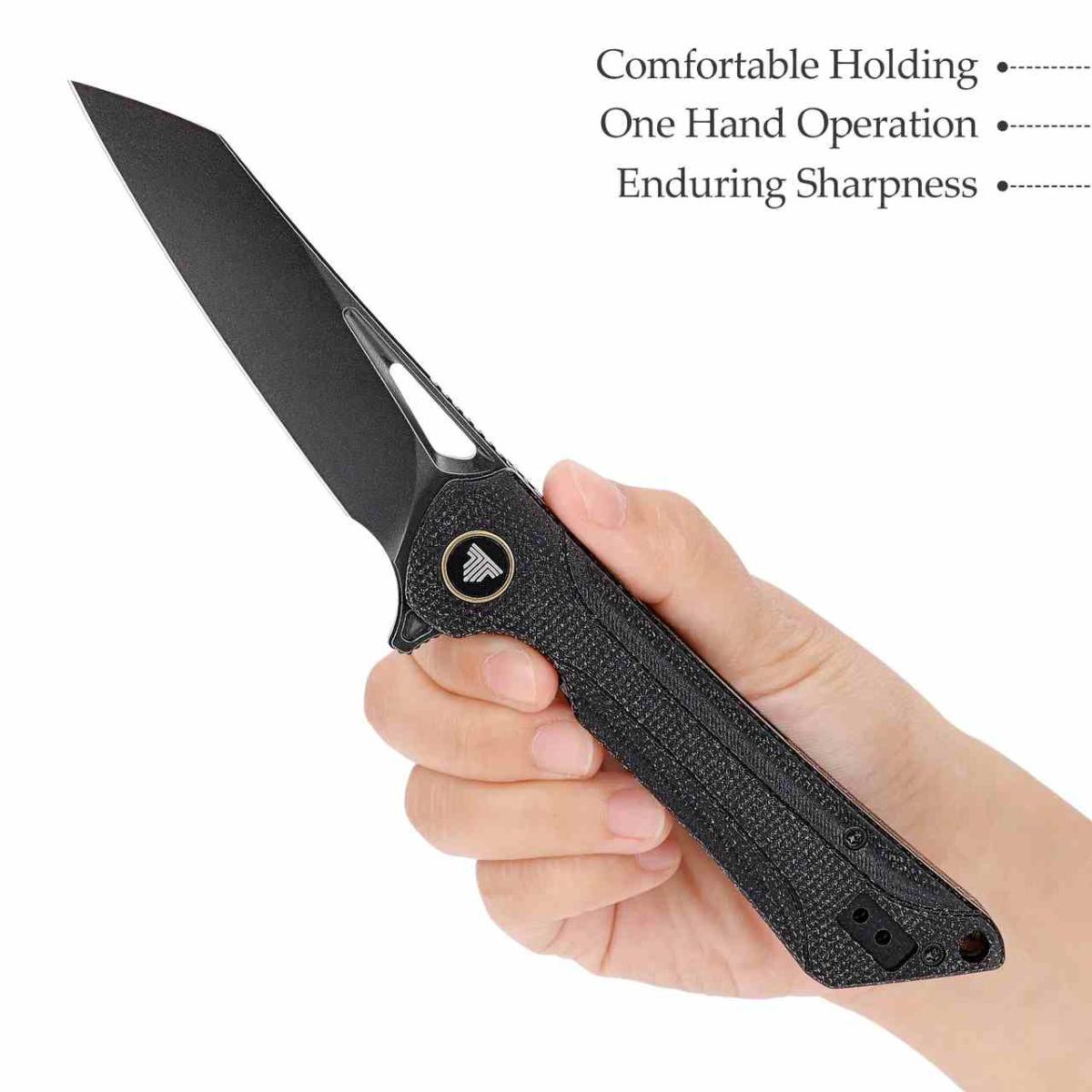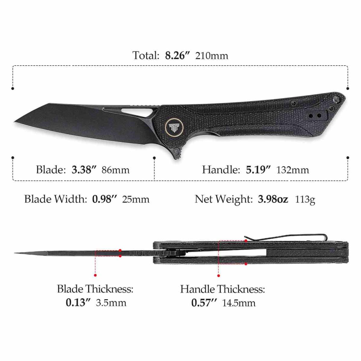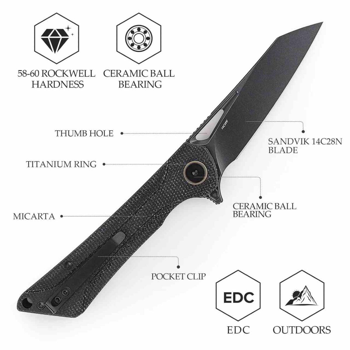 La lame au profil Cleaver (couperet) est forgée en Lame Acier 14C28N, l'acier inoxydable suédois de haute qualité de chez Sandvik. Elle bénéficie d'un traitement thermique offrant une dureté de 58-60 HRC, assurant une excellente rétention du tranchant. Sa finition Black Stonewash (noir délavé) lui donne un aspect tactique mat très résistant aux rayures et élimine tout reflet. L'ouverture est d'une fluidité remarquable grâce au système de roulements à billes en céramique (Ceramic ball bearing), activable instantanément via le flipper.