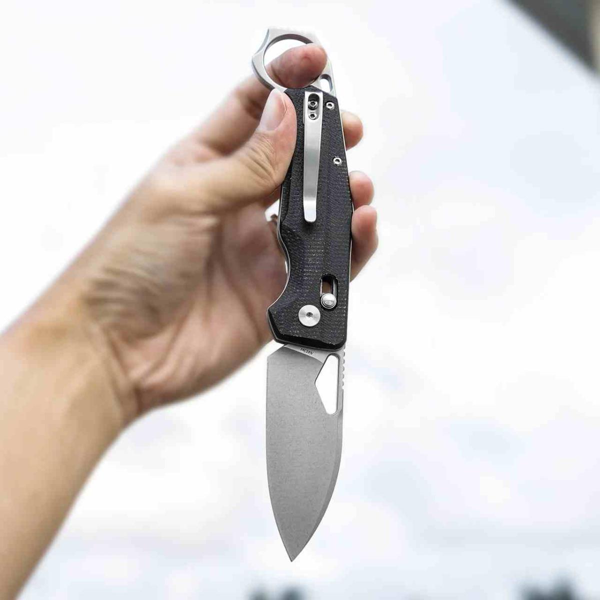 La lame au profil Hawkbill est forgée en Lame Acier 14C28N Sandvik. Elle bénéficie d'une finition Satin et d'une dureté de 59-60 Rockwell (HRC), garantissant un tranchant durable et résistant. L'ouverture est d'une fluidité exceptionnelle grâce au système de roulements à billes en céramique (Ceramic Ball Bearing), activable d'une seule main via le Thumb Hole.