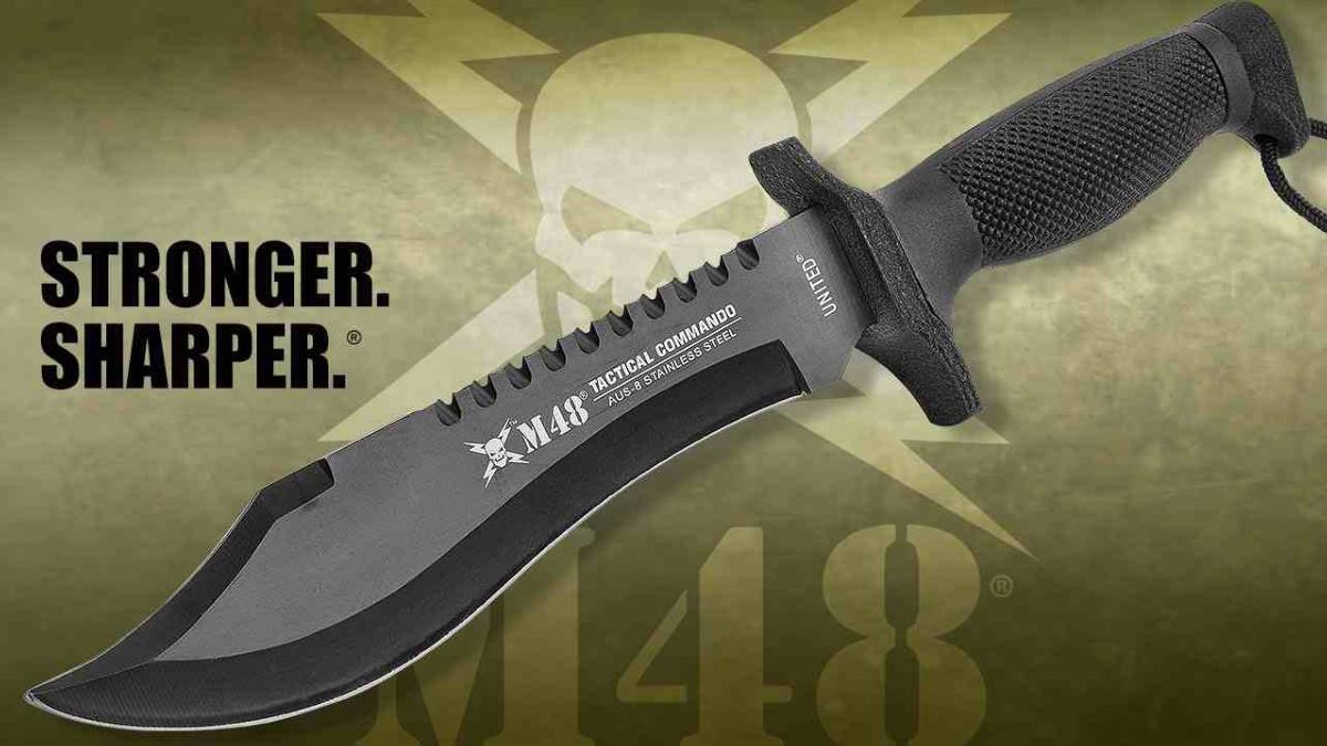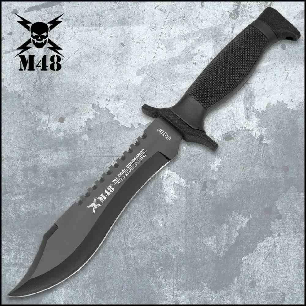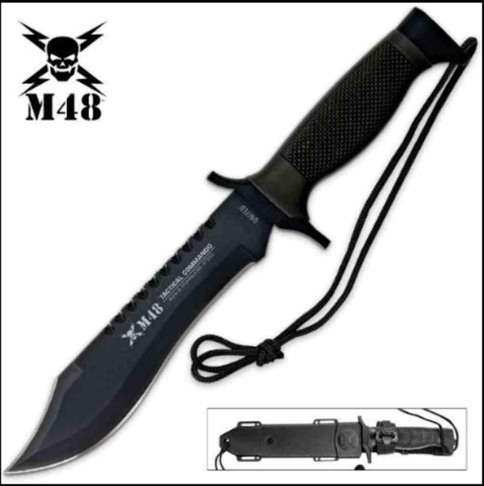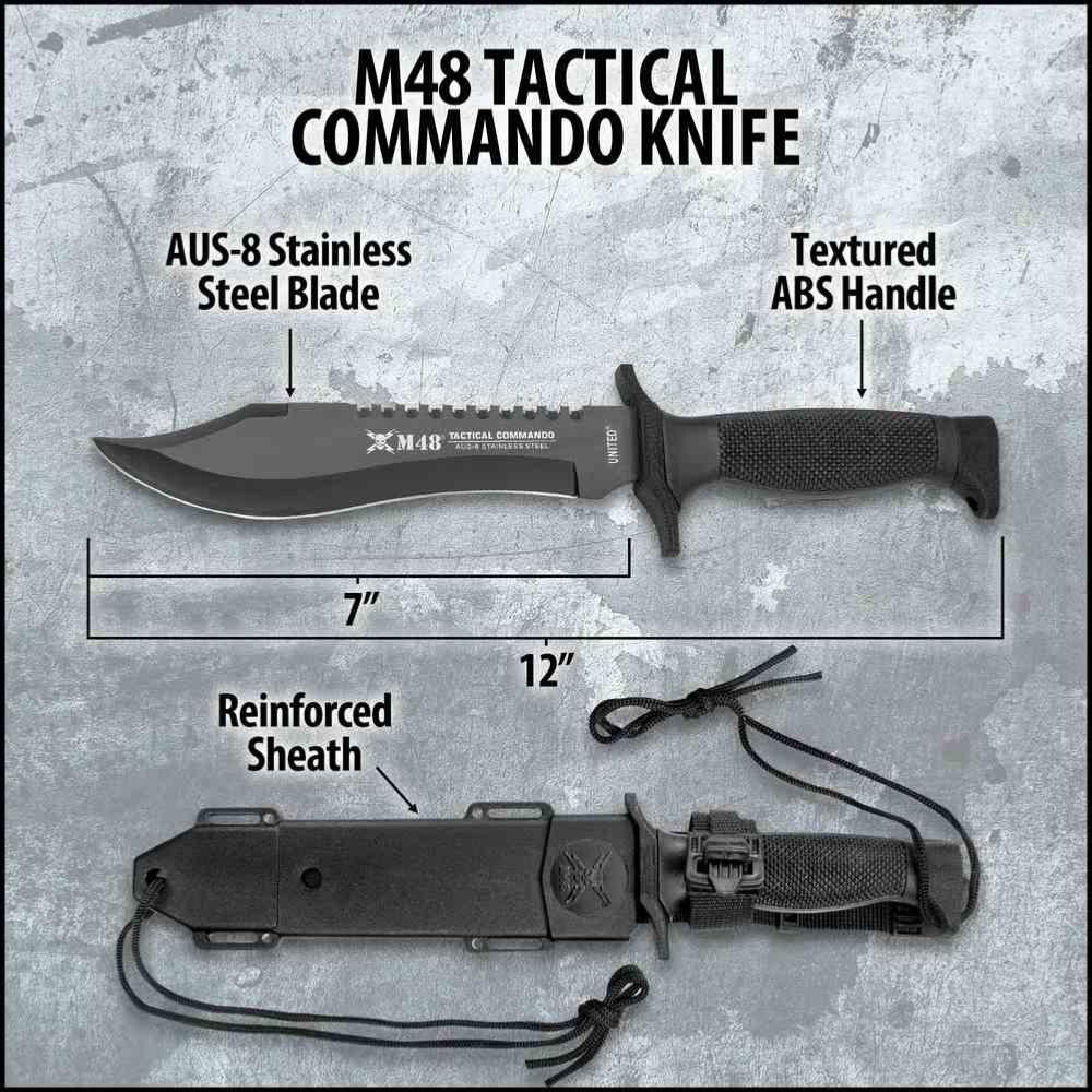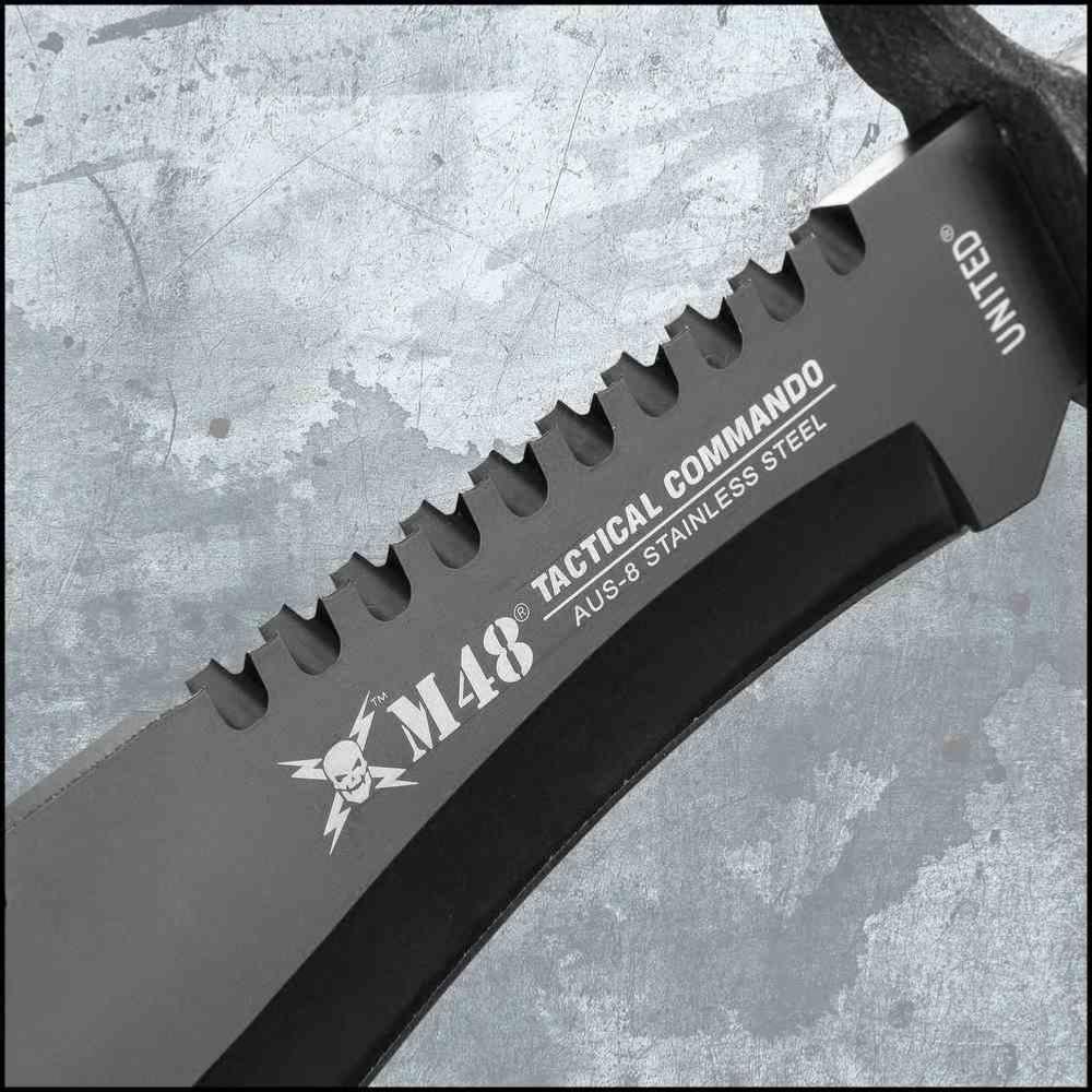 Le M48 Tactical Commando UC2994 est un couteau fixe conçu pour les missions de terrain, la survie et les usages intensifs. Sa lame drop point en acier inoxydable AUS-8 mesure 165 mm, avec un dos cranté agressif pour les coupes secondaires ou le sciage léger. Sa géométrie robuste et sa pointe renforcée en font un outil fiable en conditions extrêmes.