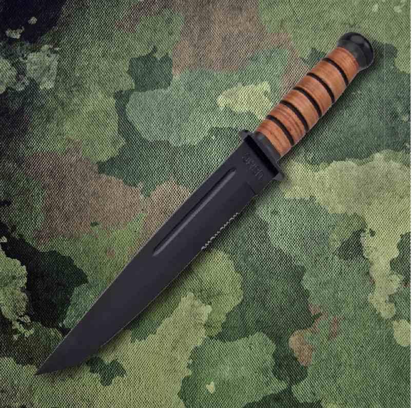 Le manche est en cuir empilé, dans le style classique des couteaux militaires USMC, avec une garde noire non réfléchissante pour sécuriser la prise. L’ensemble est livré avec un étui ceinture en cuir embossé, permettant un port confortable et une présentation élégante.