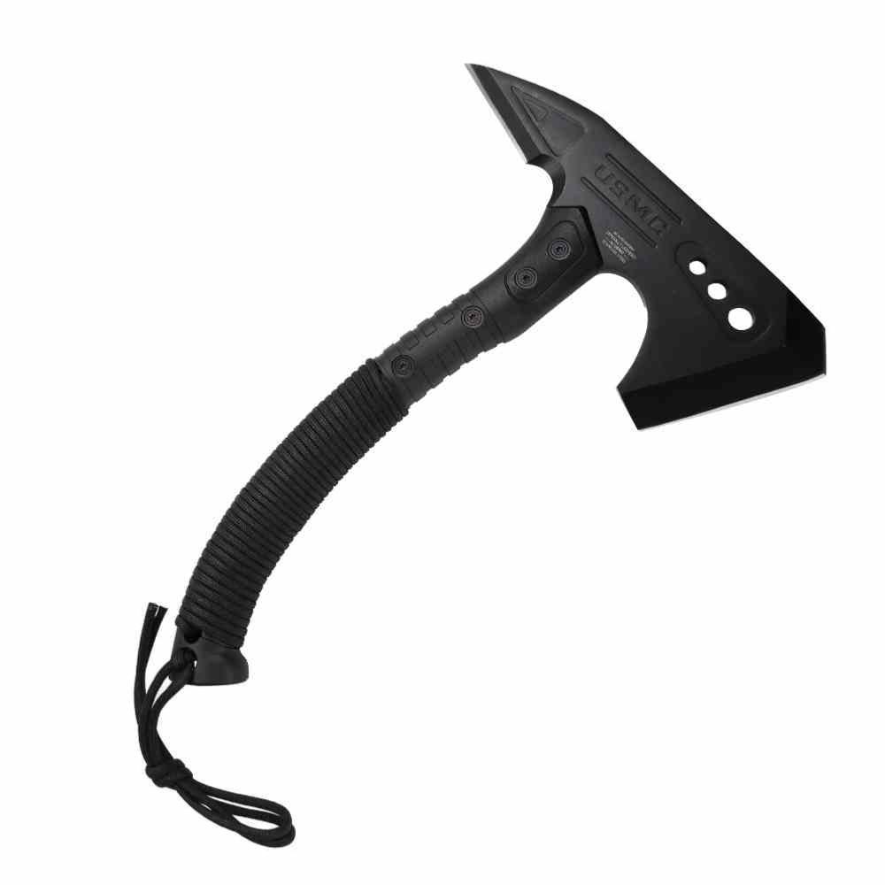 La USMC USMAXE3001BK est une hache tactique compacte conçue pour les activités outdoor, militaires ou de survie. Sa tête tomahawk en acier inox 3Cr13MoV est dotée d’une finition black oxide, avec un tranchant principal de 3.13" (7.95 cm) et un pic arrière (spike) pour les perforations ou les usages défensifs. Le manche est enveloppé de corde nylon noire, offrant une prise en main sécurisée et antidérapante. L’ensemble est livré avec un étui ceinture en nylon noir.