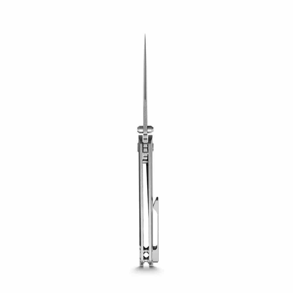 Le manche est entièrement usiné en Titanium 6AL4V avec une finition Blue Anodized (anodisé bleu), offrant une solidité structurelle à toute épreuve pour un poids plume. La sécurité est assurée par un mécanisme Frame Lock avec un insert en acier trempé pour garantir une longévité maximale du verrouillage. Le manche présente une ergonomie profilée 3D et inclut un clip de poche en titane usiné pour un port discret et sécurisé.