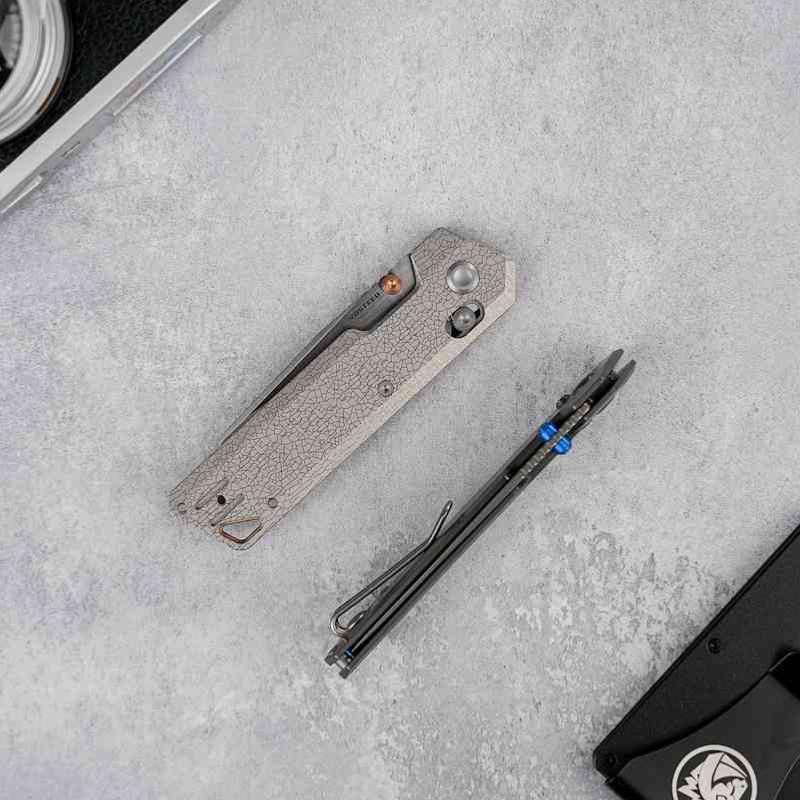 La lame arbore une finition satinée et brossée, tandis que le manche en titane Arctic Crackle présente un motif givré unique, évoquant les paysages polaires. Le système de verrouillage Crossbar Lock est ambidextre, fluide et sécurisé. L’ouverture se fait via un thumb stud en aluminium bleu, assorti au backspacer.