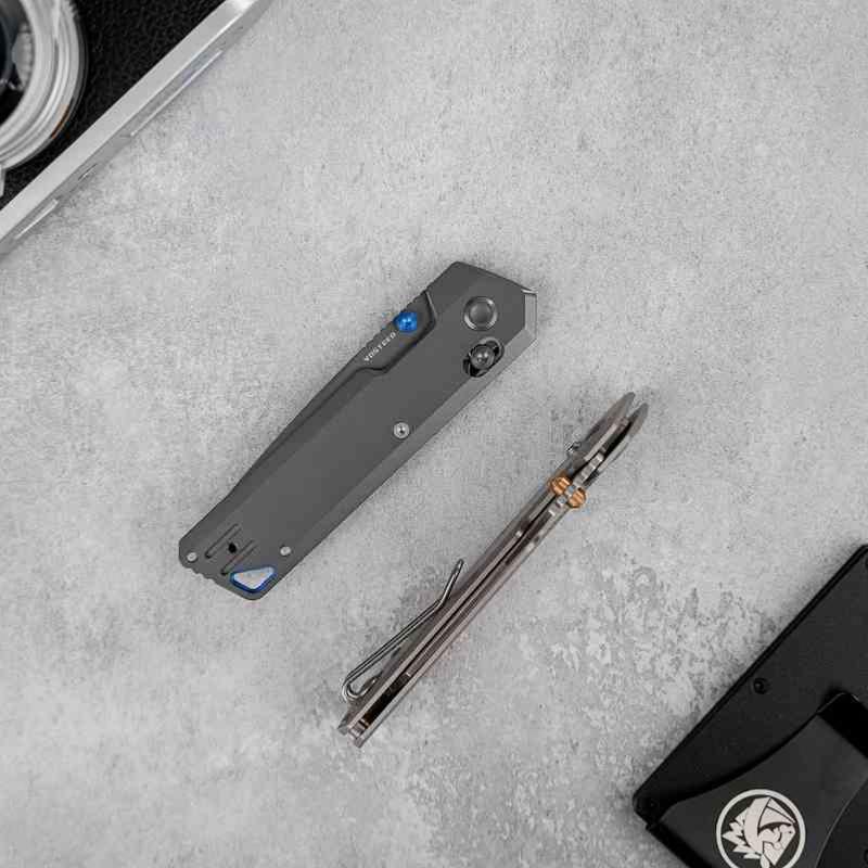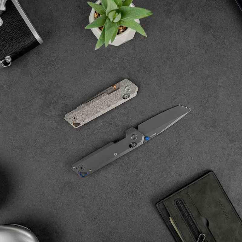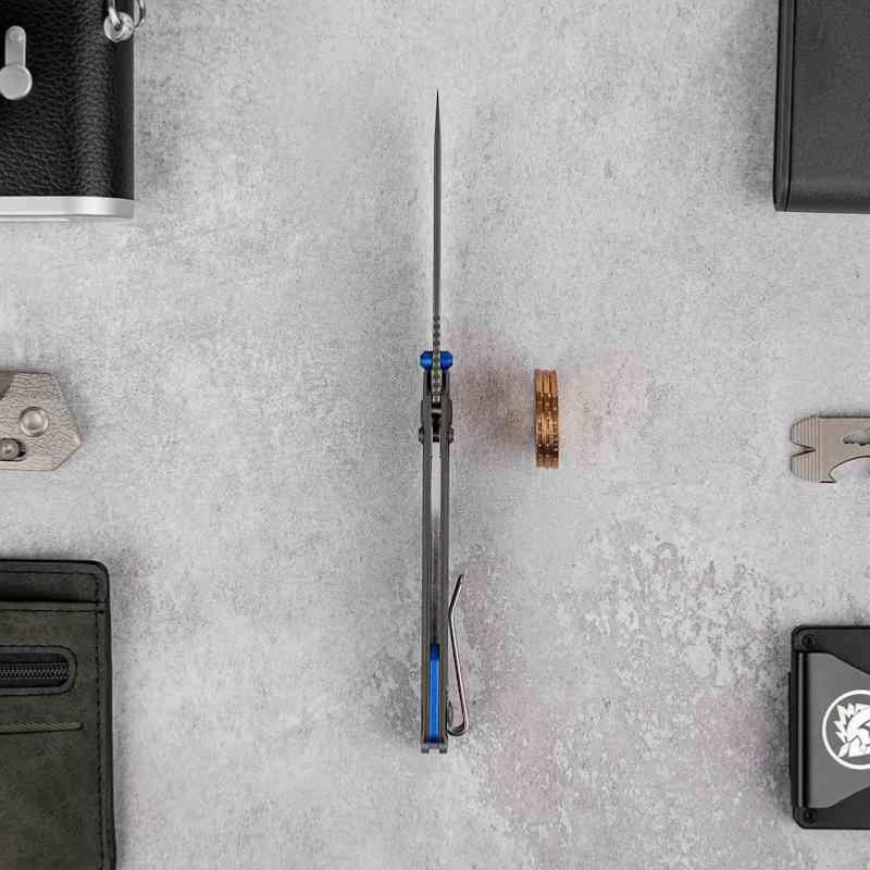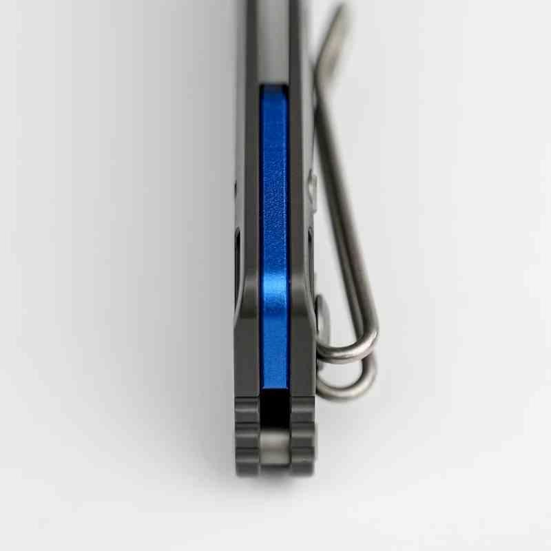 La finition Destroyer Gray sur la lame et le manche en titane Dim Gray confère au couteau une esthétique sobre et futuriste, inspirée de l’ingénierie spatiale. Le système de verrouillage Crossbar Lock est ambidextre, fluide et sécurisé. L’ouverture se fait via un thumb stud en aluminium bleu, assorti au backspacer.