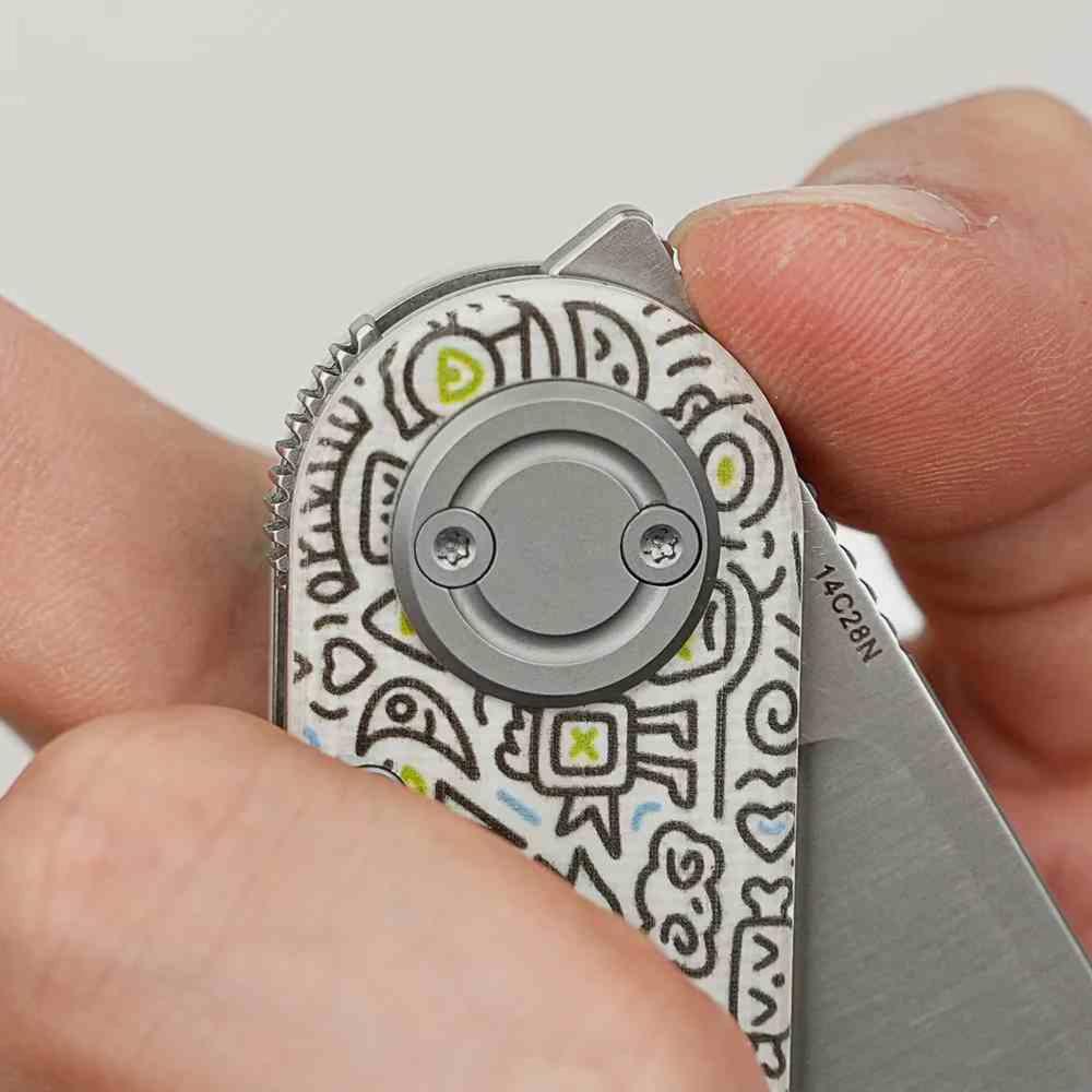 La lame au profil Drop Point est forgée en Lame Acier 14C28N, l'acier suédois de référence. Elle affiche une dureté de 58-60 HRC, garantissant que même le plus facétieux des monstres garde un tranchant rasoir. Sa finition Satin impeccable contraste avec le chaos joyeux du manche. Le déploiement est d'une fluidité totale grâce aux roulements à billes en céramique, activable par une double ouverture flipper symétrique pour un "fidget factor" addictif.