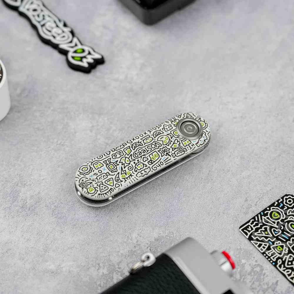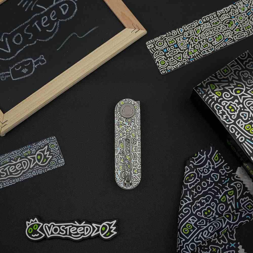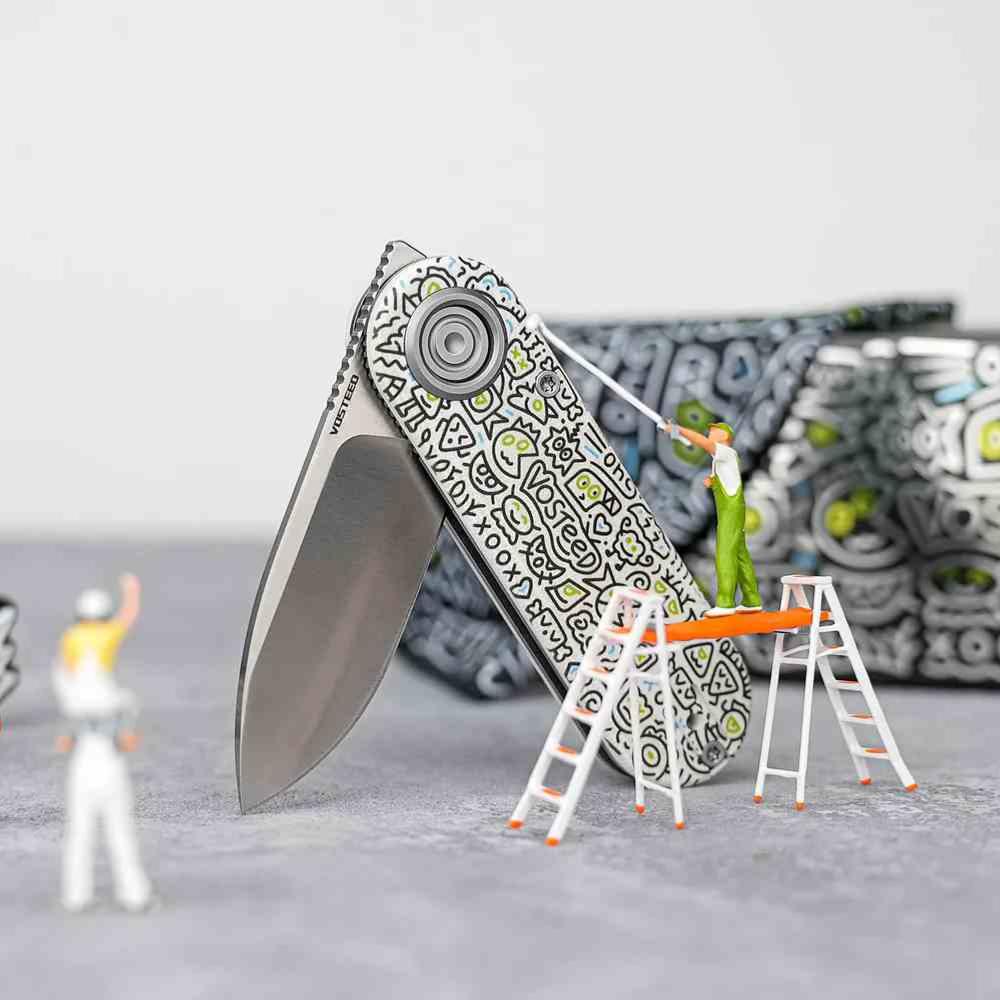 Le manche est le cœur du projet : réalisé en plaquettes de G10 avec des gravures laser Doodle Monster. Des formes excentriques, des petits monstres ridicules et des détails cachés parcourent la surface, transformant chaque prise en main en une nouvelle découverte. La sécurité est assurée par le mécanisme Trek Lock, un système de verrouillage par bouton rotatif qui permet de jouer avec votre couteau et de le fermer sans jamais approcher vos doigts de la lame.