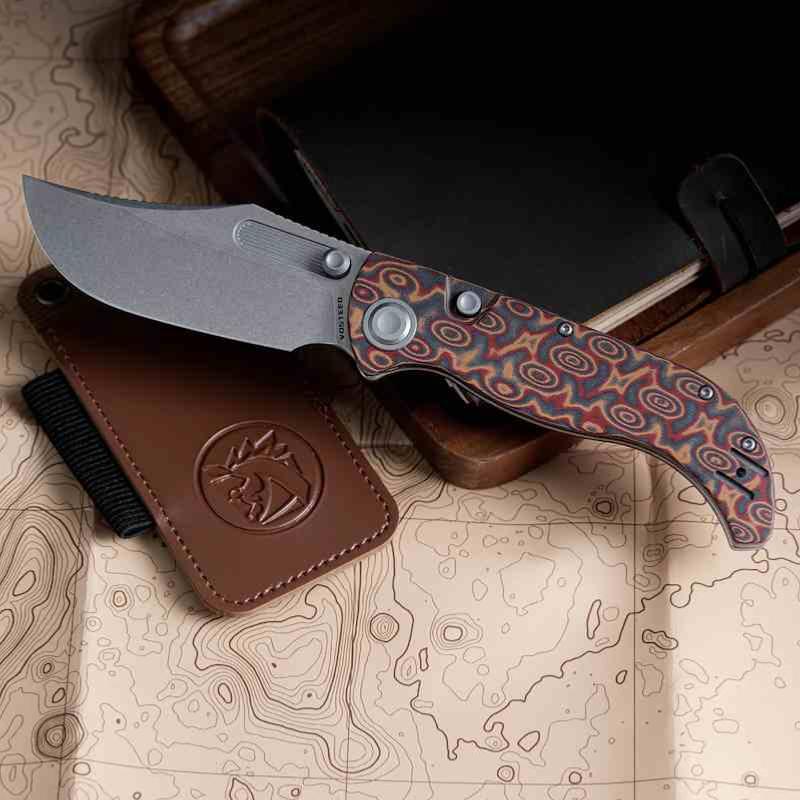 Le manche est en Micarta Raindrop, usiné en 3D pour une ergonomie optimale et une esthétique dynamique. Le système de verrouillage Top Liner Lock assure une sécurité renforcée, avec un stop pin indépendant pour éviter les déverrouillages accidentels. Le couteau s’ouvre via un thumb stud ou une gorge usinée pour une double méthode de déploiement.