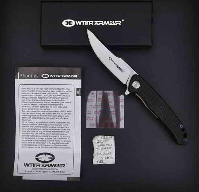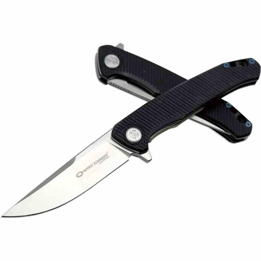 Description produit Le WithArmour Flint WAR091BKG est un couteau pliant moderne et robuste, conçu pour l’EDC quotidien. Sa lame clip point de 8,9 cm en acier D2 tool steel offre une excellente tenue de coupe et une résistance supérieure à l’usure. La finition satinée lui confère un look élégant et professionnel.